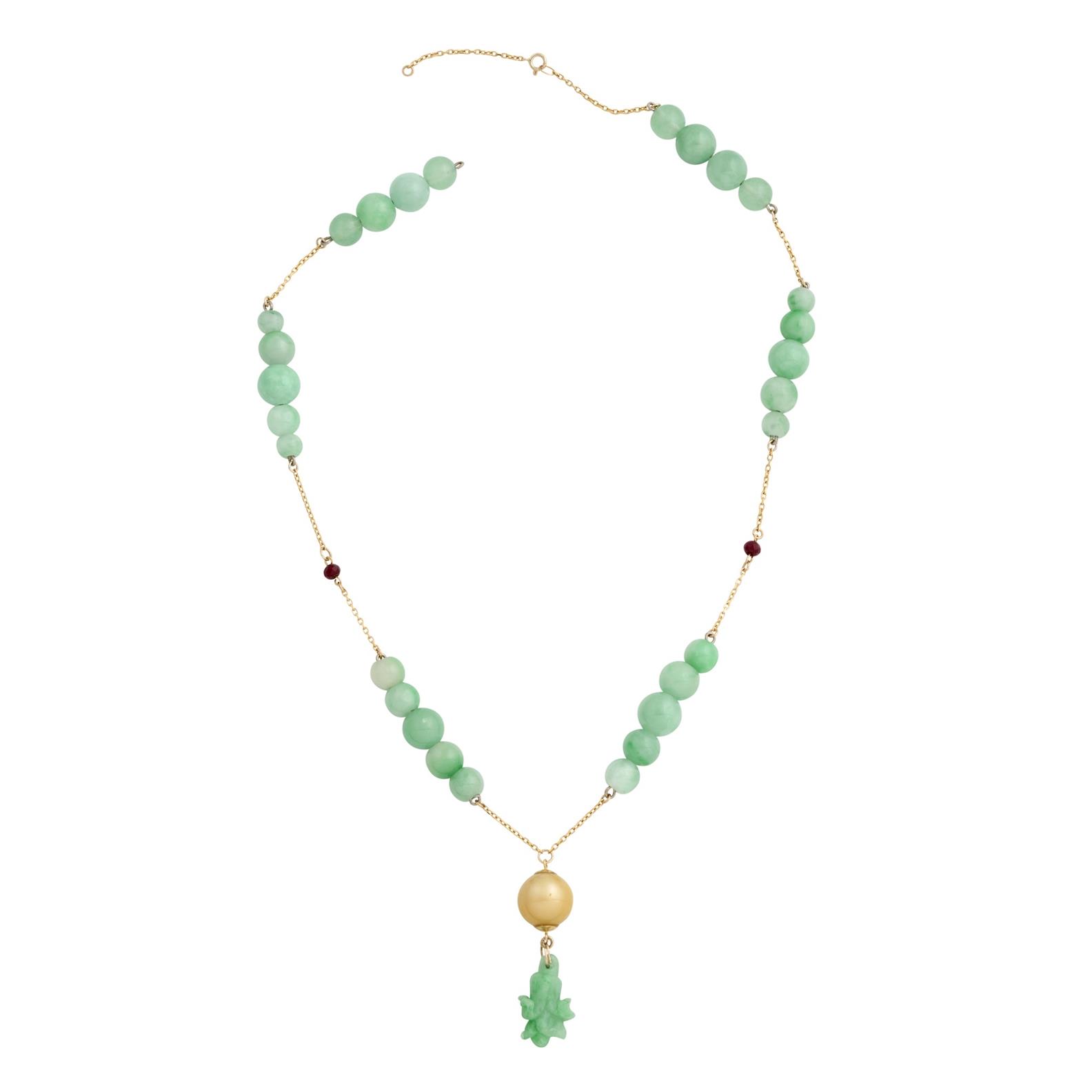 Composed of a trace link chain, decorated at intervals by round polished jadeite beads and faceted garnet beads, terminating in a carved jadeite, surmounted by a cultured pearl, mounted in 9ct gold, pendant length 45mm, inner circumference 490mm, gross weight approximately 38.8 grams.
