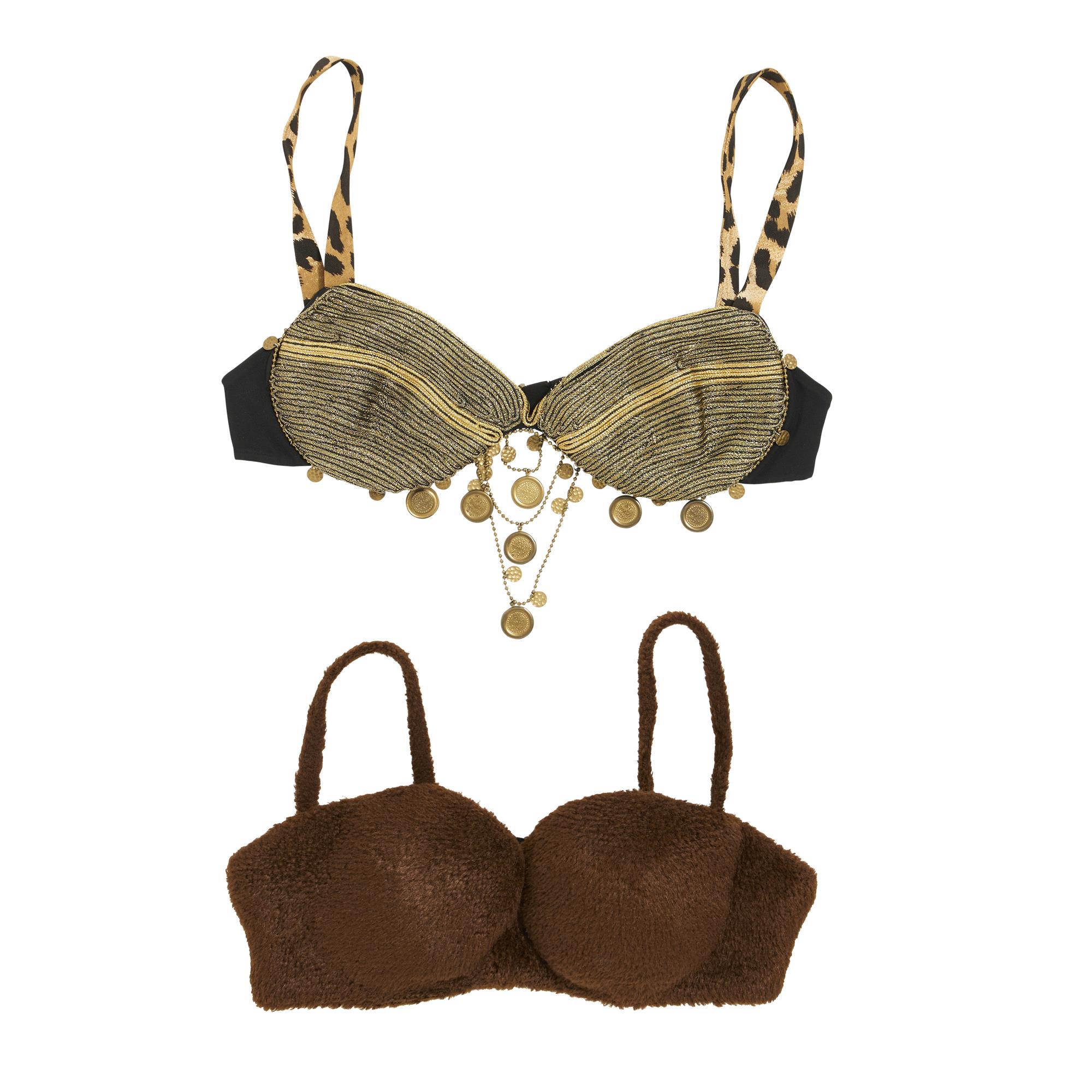 Comprising of an Alaia bustier styled in brown faux fur with hook and eye closure at centre back, size unmarked; together with an Ozbek bustier styled in metallic gold lurex featuring leopard print straps and gold tone coin charms under the bustline, marked size 42.