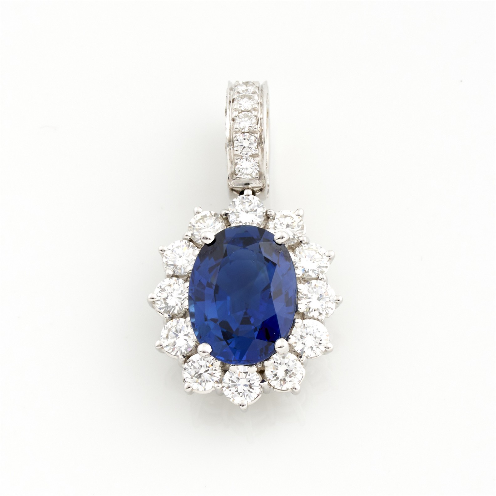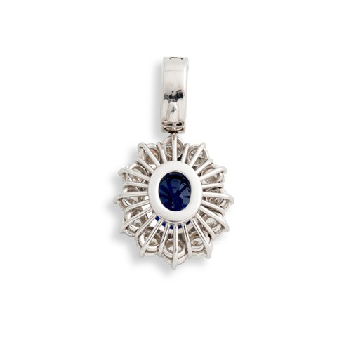 Of cluster design, centring a claw-set oval sapphire weighing approximately 3.50 carats, framed by a halo of similarly set brilliant-cut diamonds, surmounted by a diamond set bale, the diamonds together weighing approximately 1.20 carats, mounted in 18ct white gold, length 25mm, gross weight approximately 4.6 grams, maker's mark for Hardy Brothers
