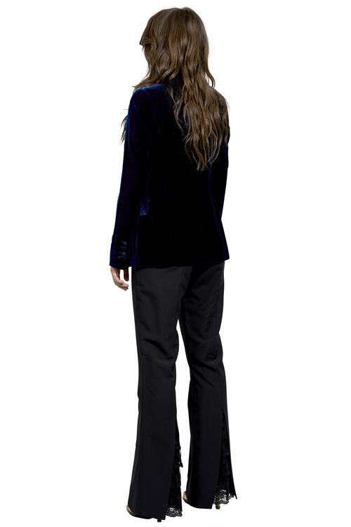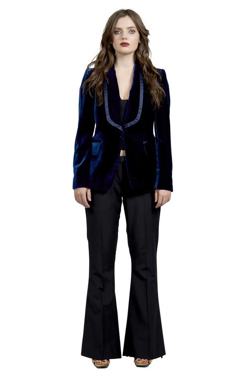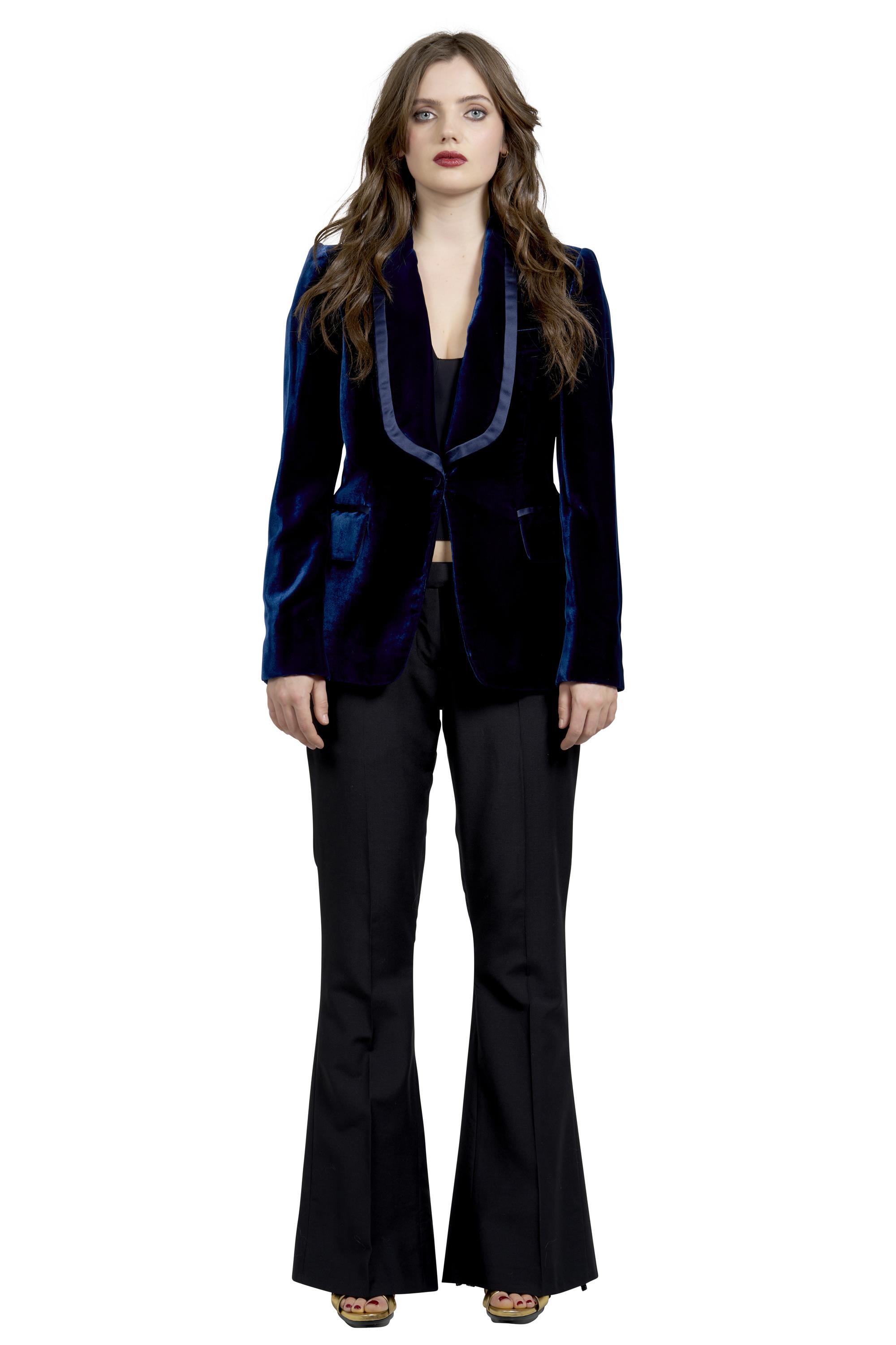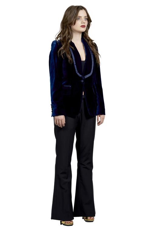 Styled in midnight blue silk velvet, single breasted with contrast satin piping to shawl collar, marked size 40.