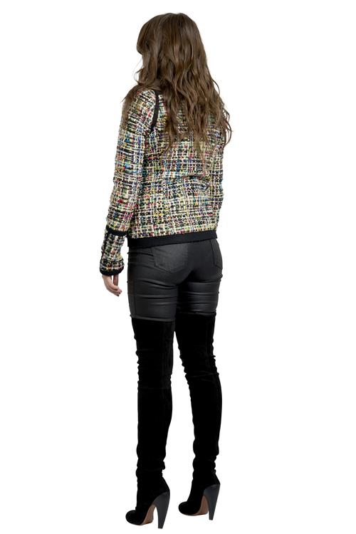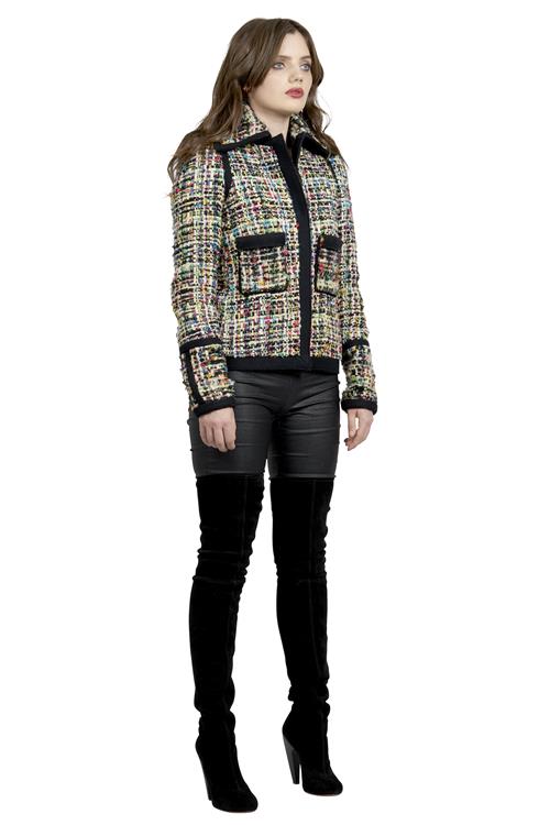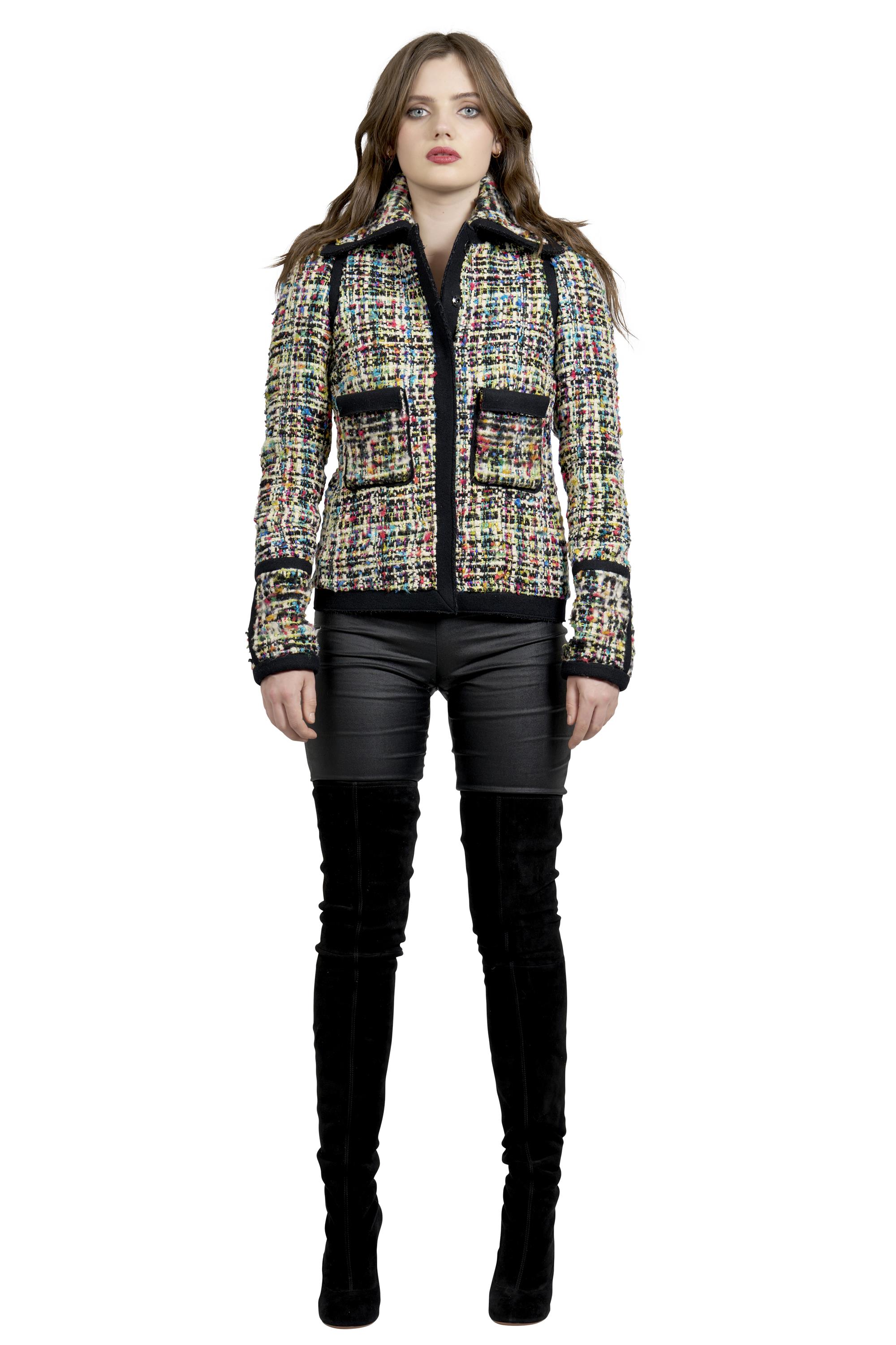 Styled in multicolour wool blend boucle with black grosgrain trim, pointed collar, and two front patch pockets, lined in quilted satin, marked size FR38.