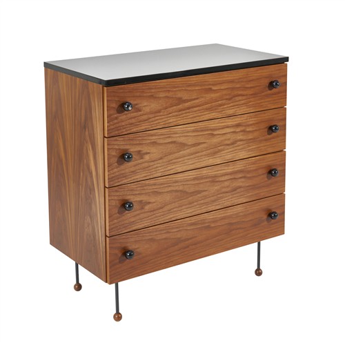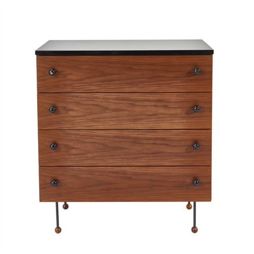 Four drawers in American walnut with drawer pulls and top surface in black gloss finish, slender metal legs with ball shaped feet.