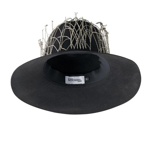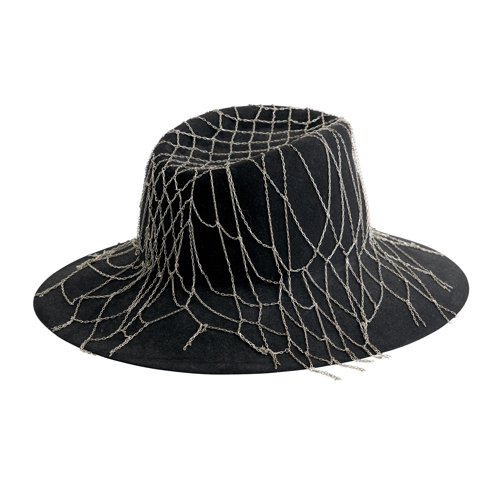 Styled in black felt wool with silver chain net overlay, grossgrain band, marked size S.
