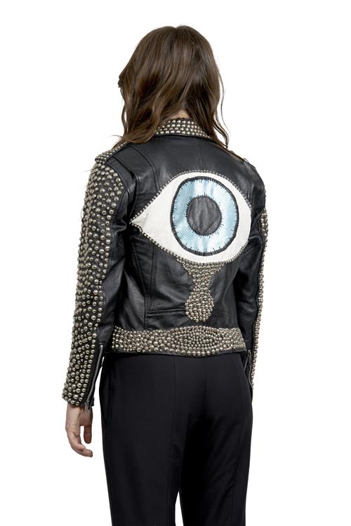 Styled in black leather with silver tone studs, featuring a sequined oversized 'evil eye' motif to the back, size unmarked.