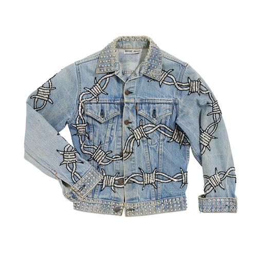 Styled with rhinestone and beaded barb wire motifs, distressed detailing and silver stud and grommet accents, both marked size S.
