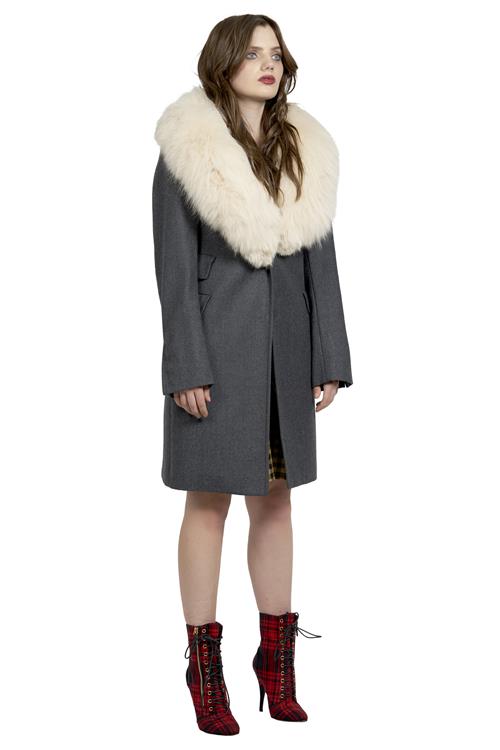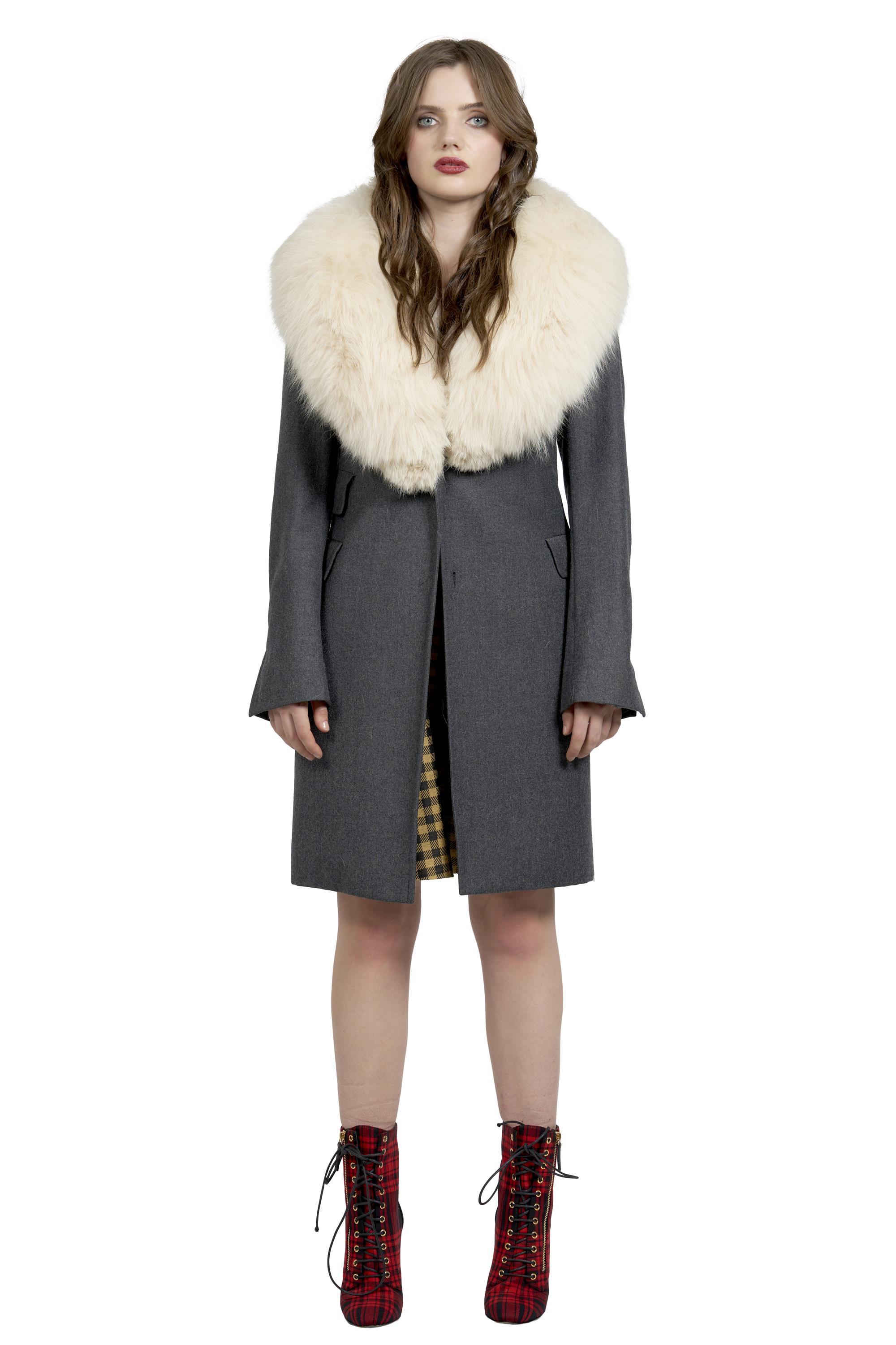 Styled in charcoal wool with an exaggerated ivory fur shawl collar, designed with pockets and concealed front fastening, marked size IT38.