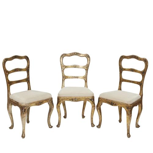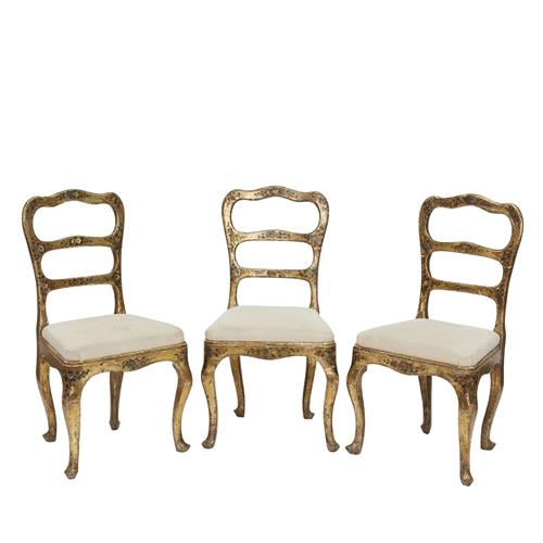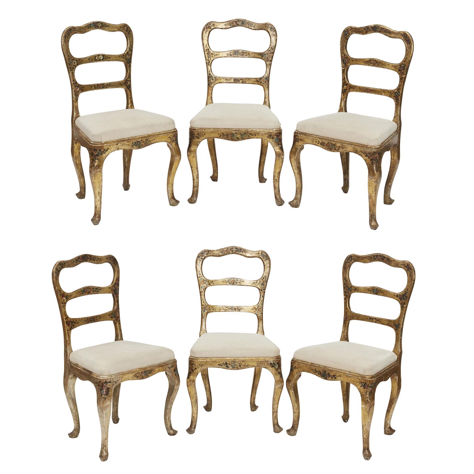 Wear to gilding and polychrome decoration throughout, separation to some joins, one chair with repair to leg.
