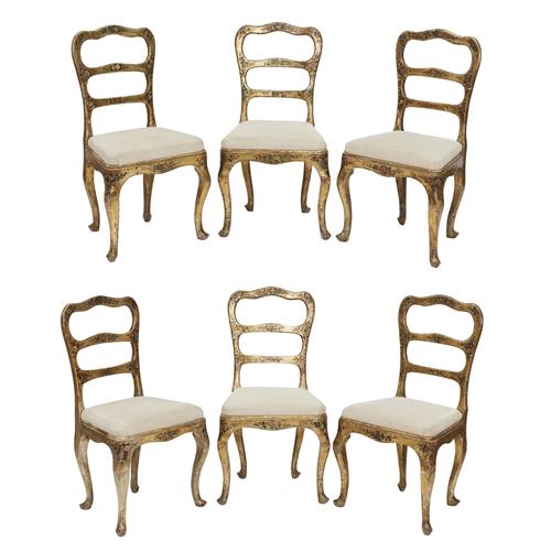 Second half 18th century, decorated overall with polychrome floral sprays, each with pierced shaped tablet back with horizontal splats, the drop-in seat upholstered in cream, on cabriole legs. (6)