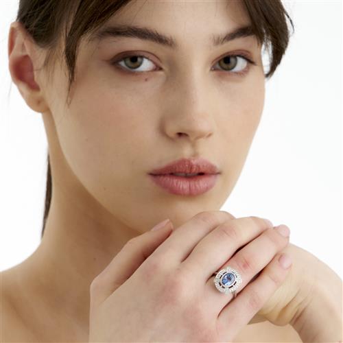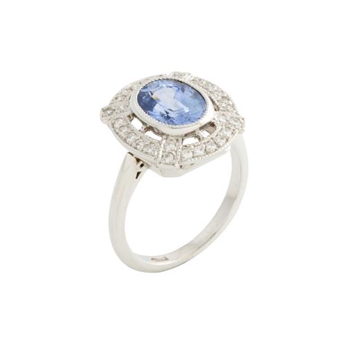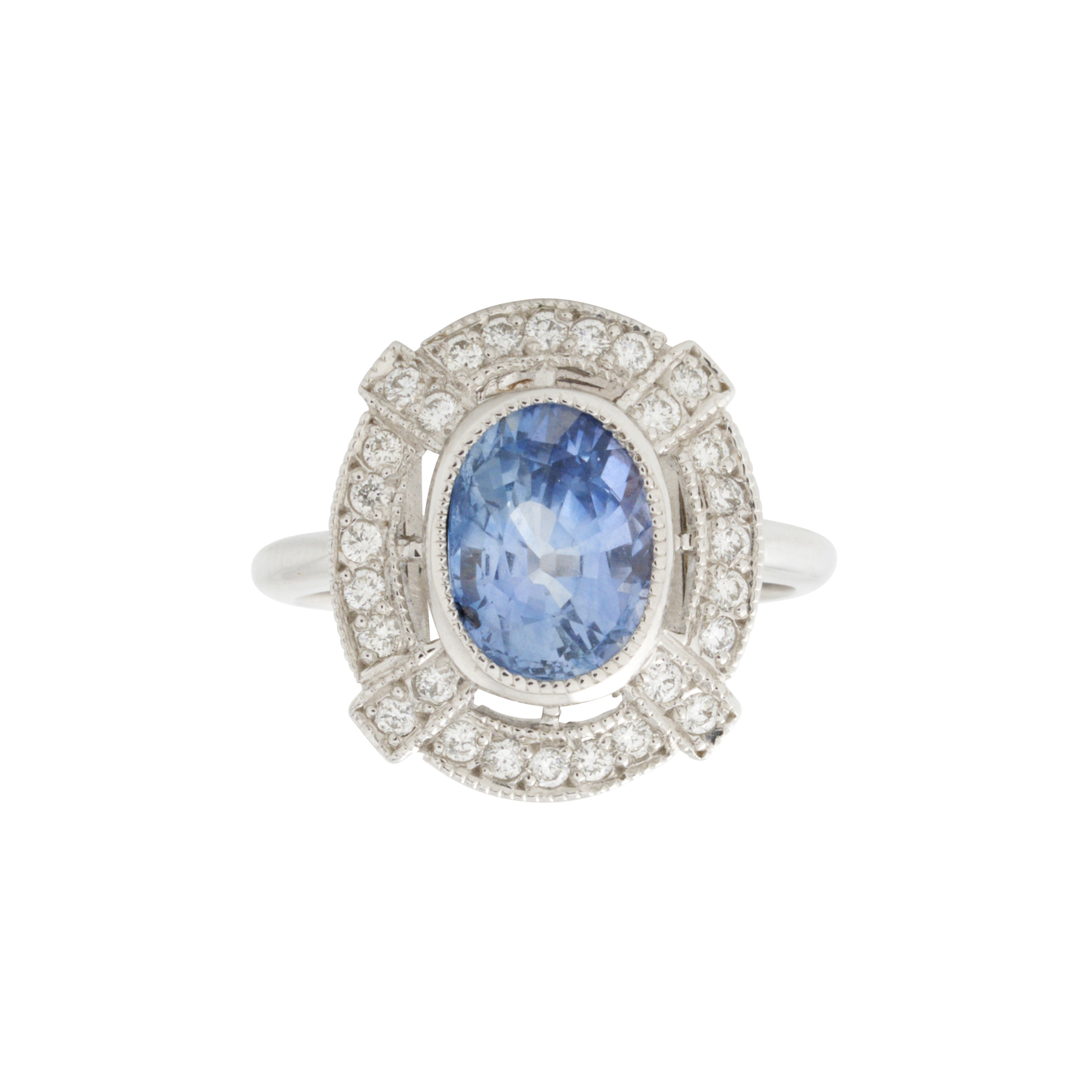 Centring a milgrain bezel-set oval mixed-cut sapphire weighing approximately 2.41 carats, within a floating style surround of milgrain-set round brilliant-cut diamonds together weighing approximately 0.29 carats, size L, gross weight approximately 5.4 grams.