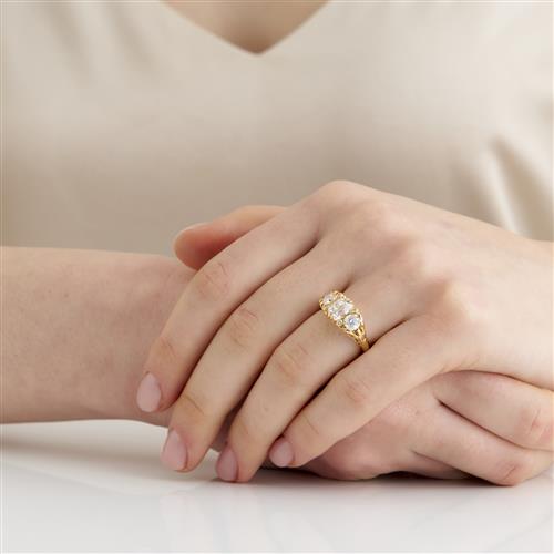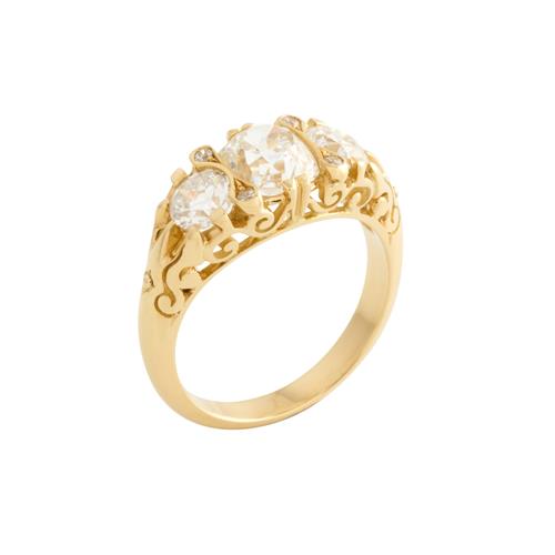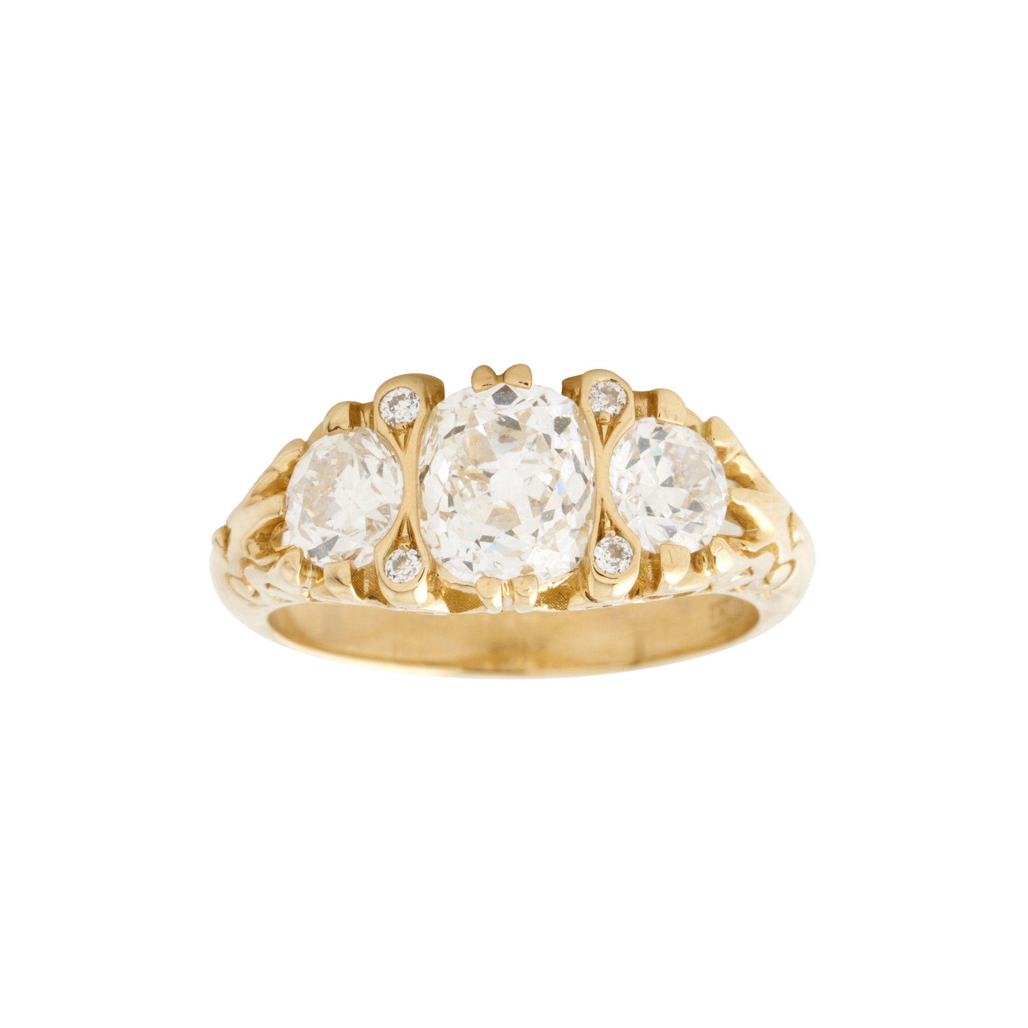Centring a claw-set old cushion-cut diamond weighing 1.48 carats, flanked by claw-set old European-cut diamonds together weighing approximately 1.00 carat, decorated between with four further old European-cut diamonds together weighing approximately 0.04 carats, with filigree details to underbezel, size M, gross weight approximately 5.1 grams.