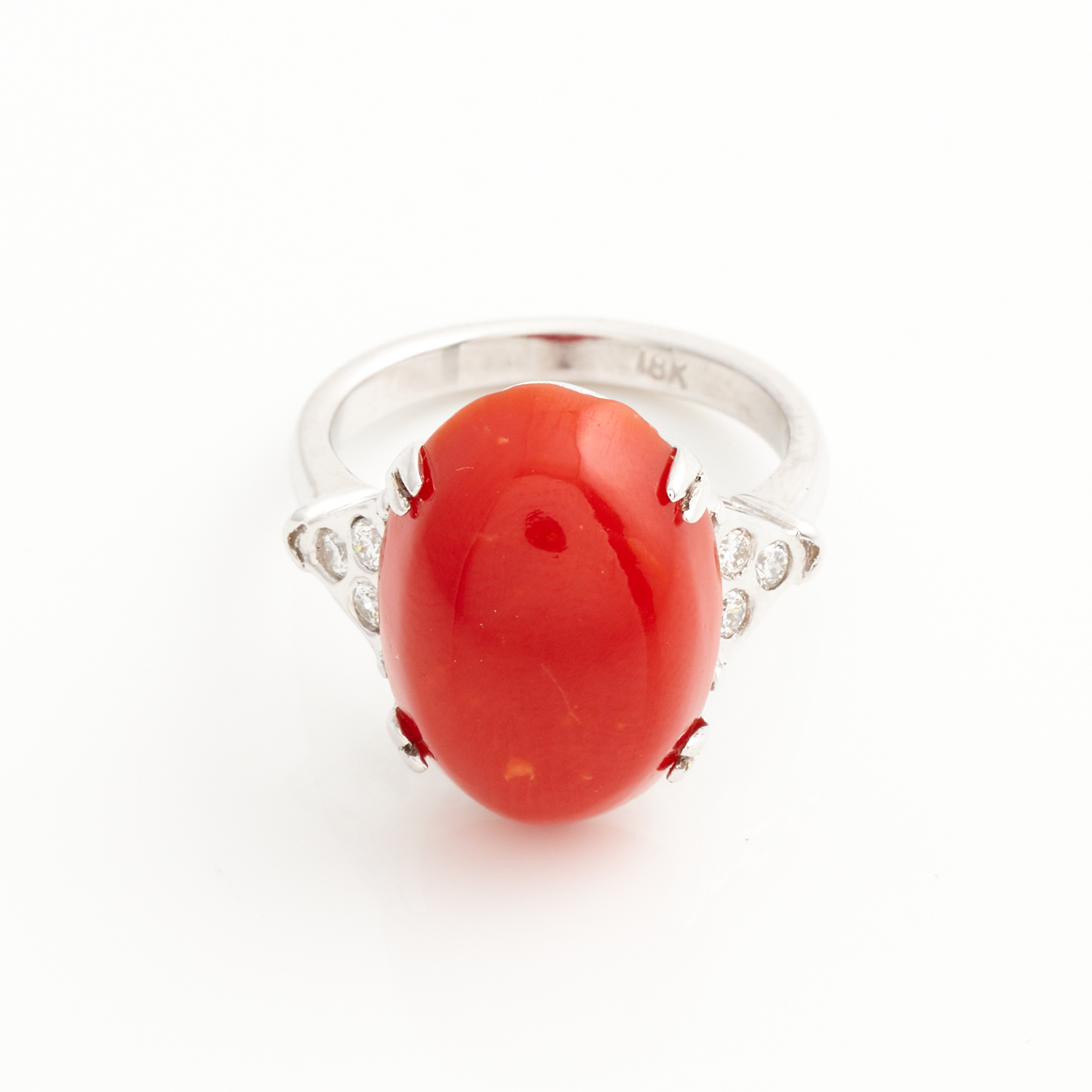 A CORAL AND DIAMOND RING IN 18CT WHITE GOLD, THE CORAL WEIGHING 10.22CTS, THE DIAMONDS TOTALLING APPROXIMATELY 0.15CTS, SIZE M, 7.28GMS