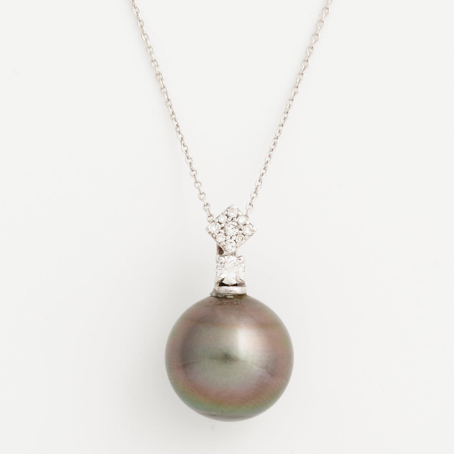A TAHITIAN PEARL AND DIAMOND PENDANT IN 18CT WHITE GOLD, THE PEARL MEASURING 15.8MM, THE DIAMONDS TOTALLING APPROXIMATELY 0.35CTS, 440MM, 7.87GMS