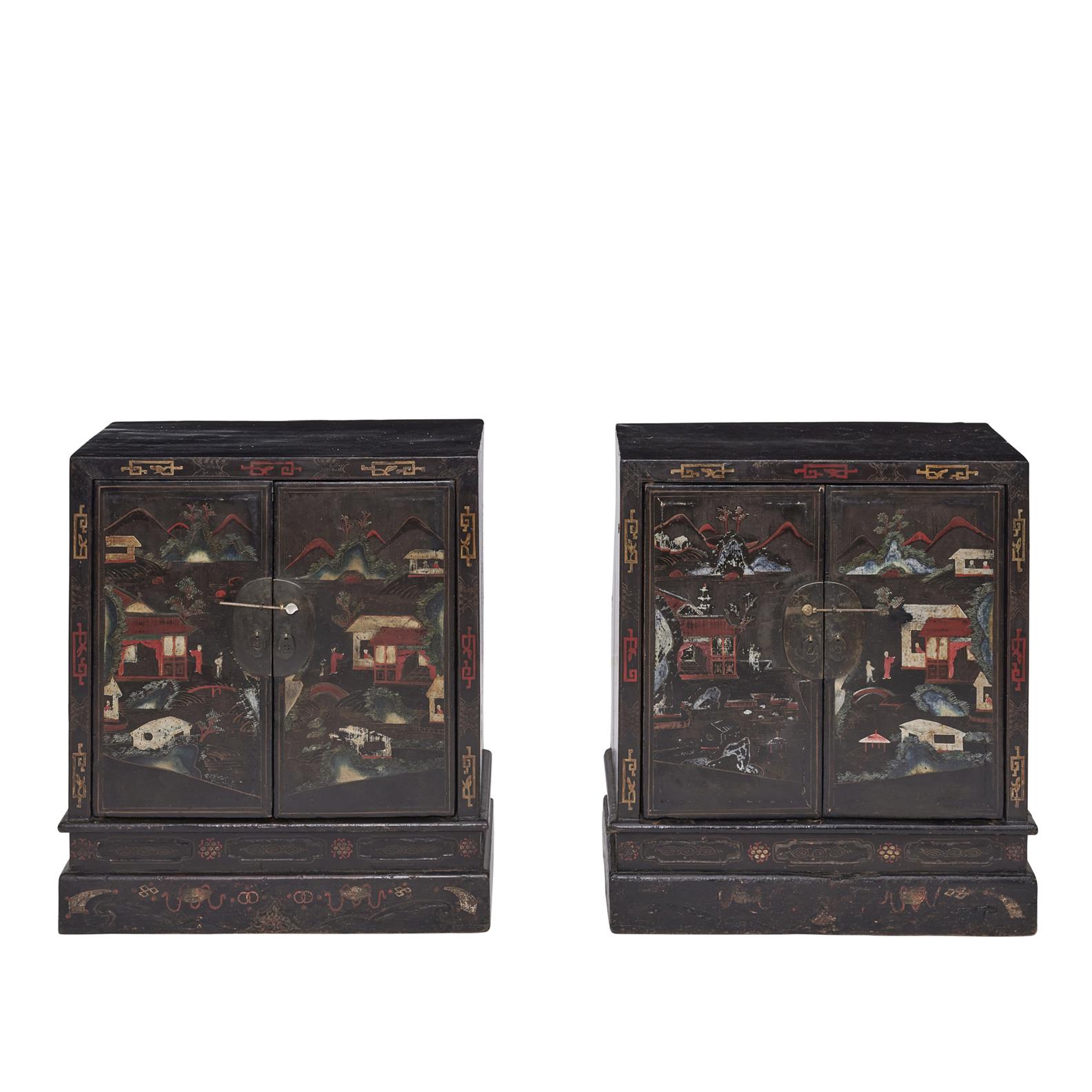 In good antique condition, with wear to decoration throughout, some cracking in places, interiors lacking shelves.