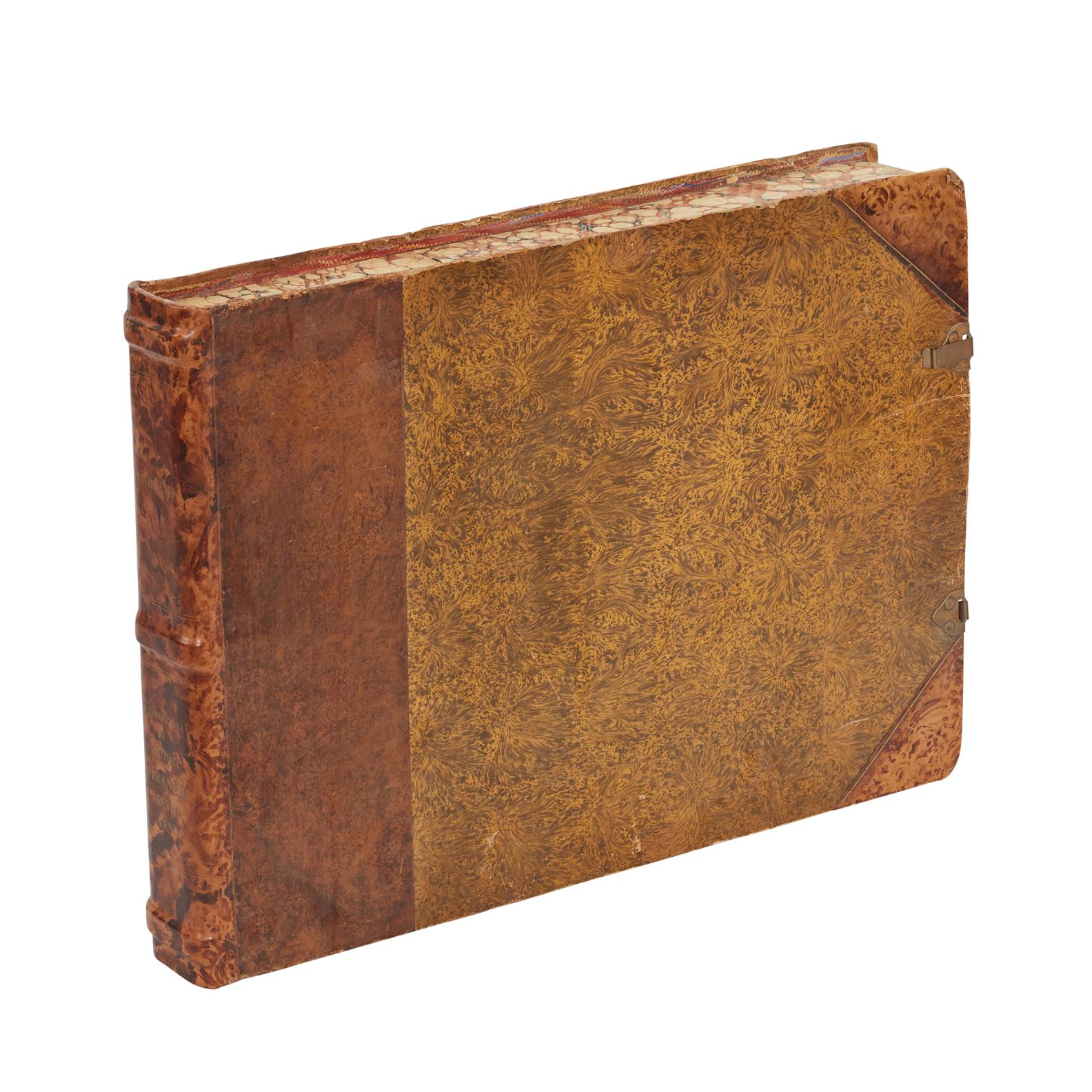 A LARGE VICTORIAN MARBLED PAPER AND LEATHER FOLIO CASE