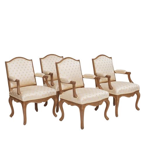 Late 18th/early 19th century, probably Liège, each with arched padded back and scrolled padded arms on cabriole legs, upholstered in bee patterned Lelievre Lampas Abeillessilk. (4)