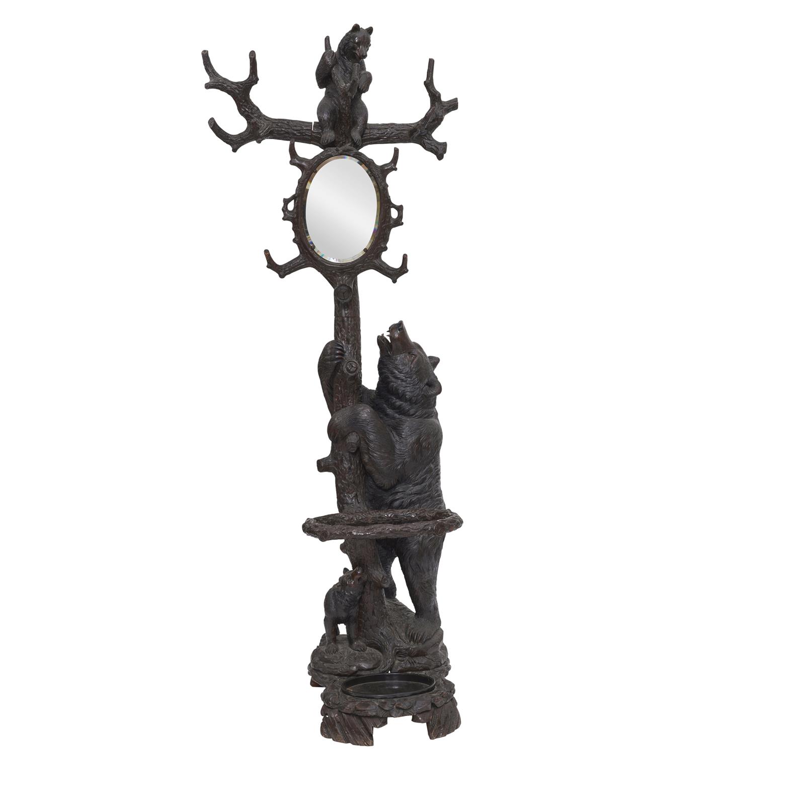 Late 19th century, the central trunk with naturalistically carved standing bear having glass eyes supporting a bear cub atop a mirror and two branches, the oval stick receptacle with zinc liner, on rockwork base.