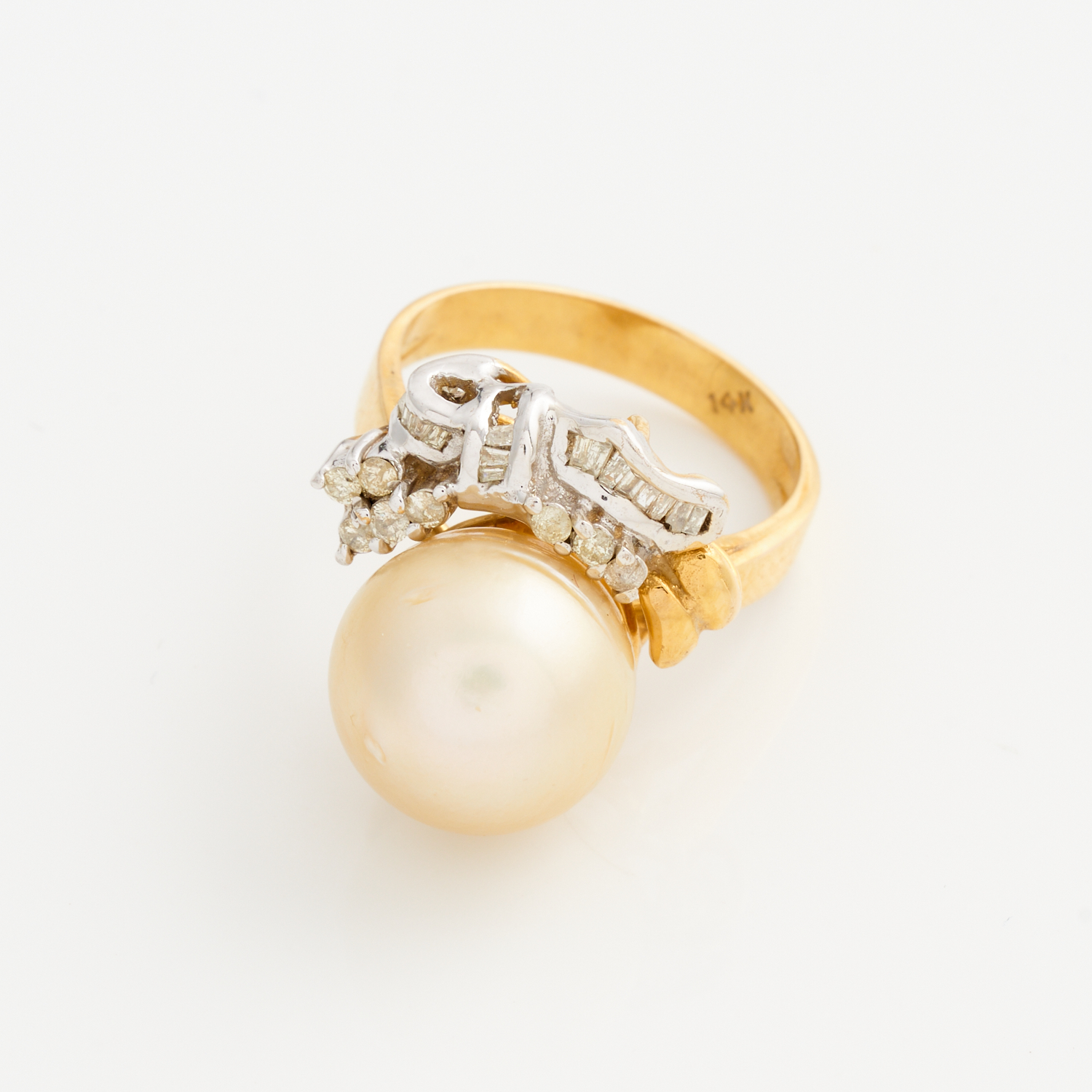 A SOUTH SEA PEARL AND DIAMOND RING IN 14CT GOLD, SIZE N 1/2, 7.50GMS