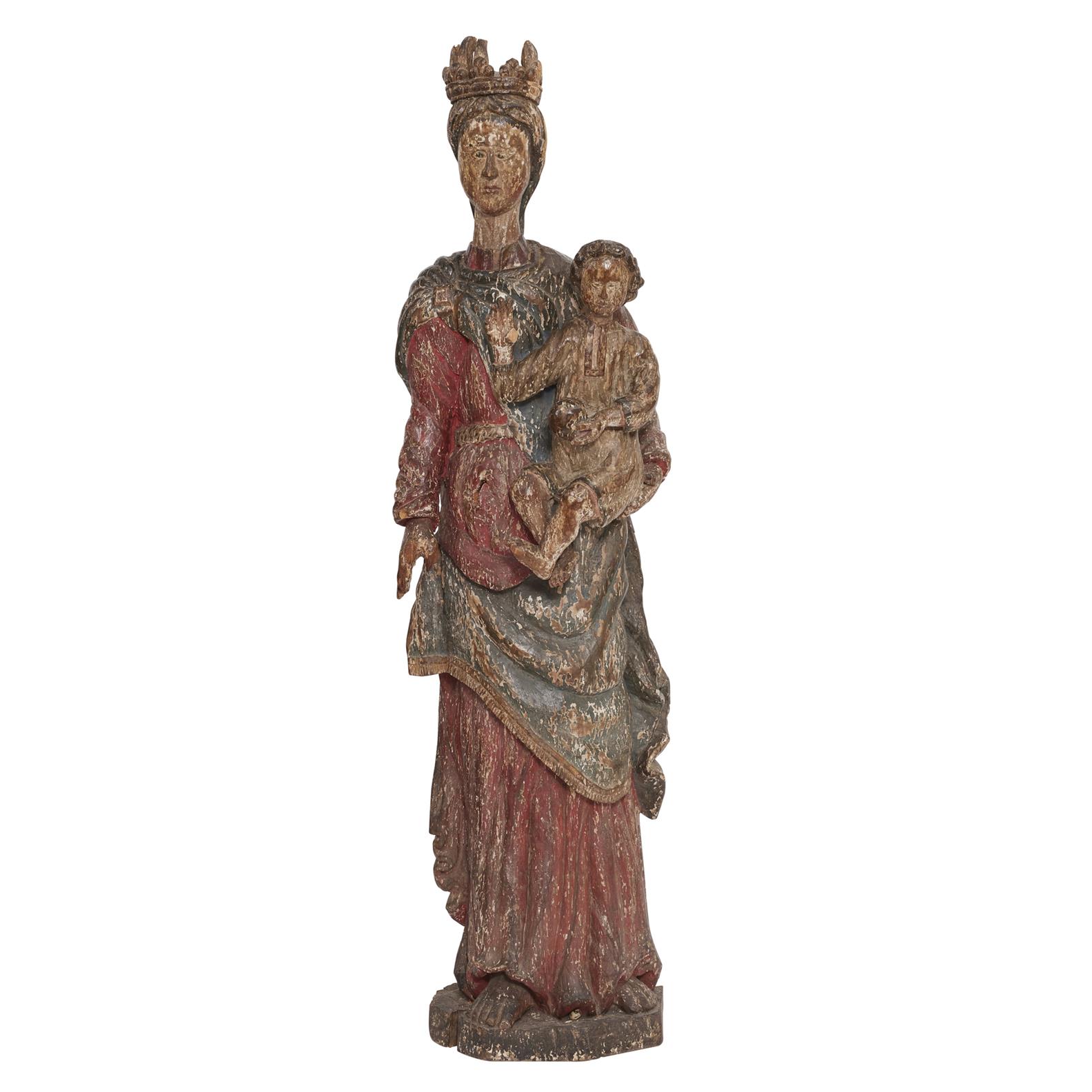 A SOUTH EUROPEAN PROVINCIAL CARVED WOOD AND POLYCHROMED STATUE OF THE VIRGIN AND CHILD