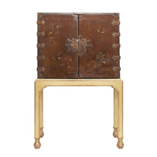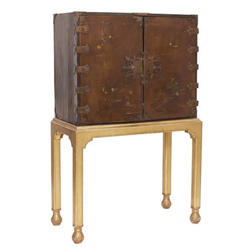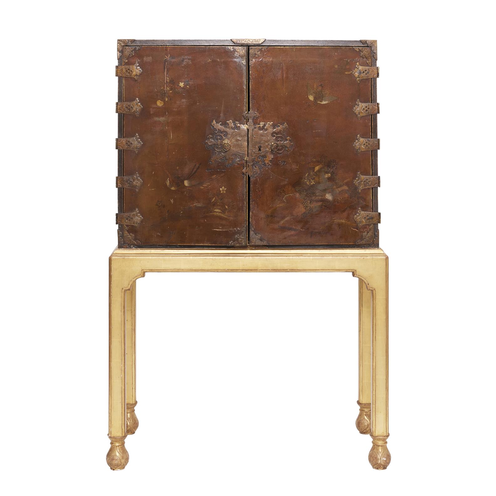 Doors of cabinet are warped and do not shut properly, no interior, crack to left door and small abrasions and cracks to both, cracks and losses to sides, gilt stand with wear to angles and scratches to gilding.