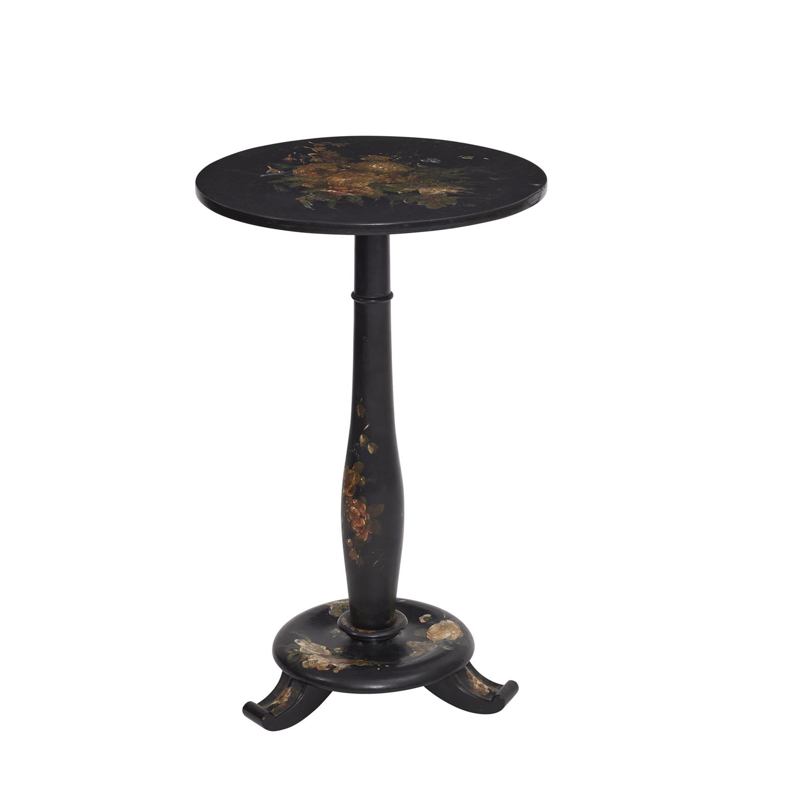 The circular tilt-top on baluster pedestal and circular base with three scrolled feet, painted with flowers throughout.