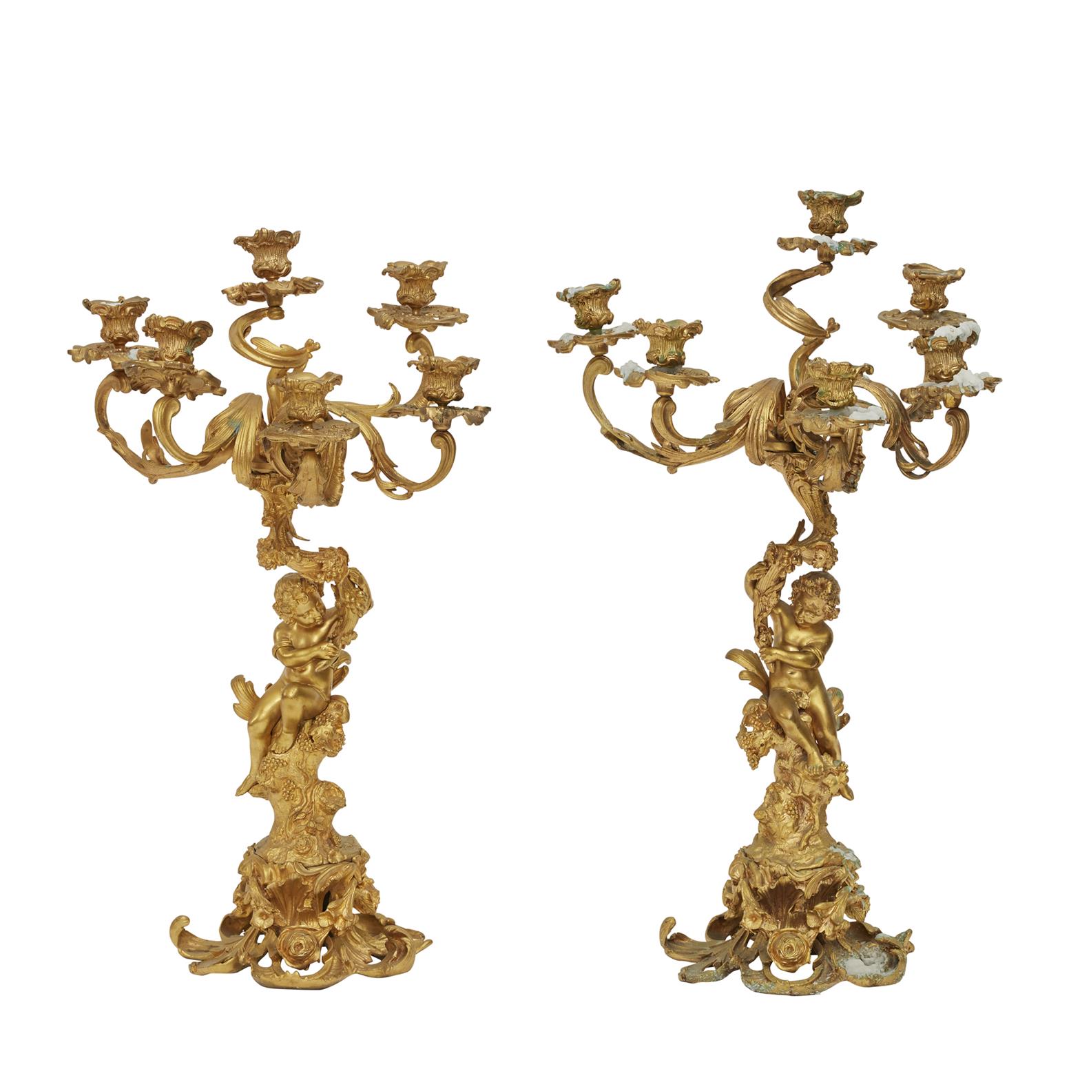 Each on a rocaille base rising to a Bacchic putto supporting a vine wreathed branch issuing six foliate branches terminating in rocaille nozzles.