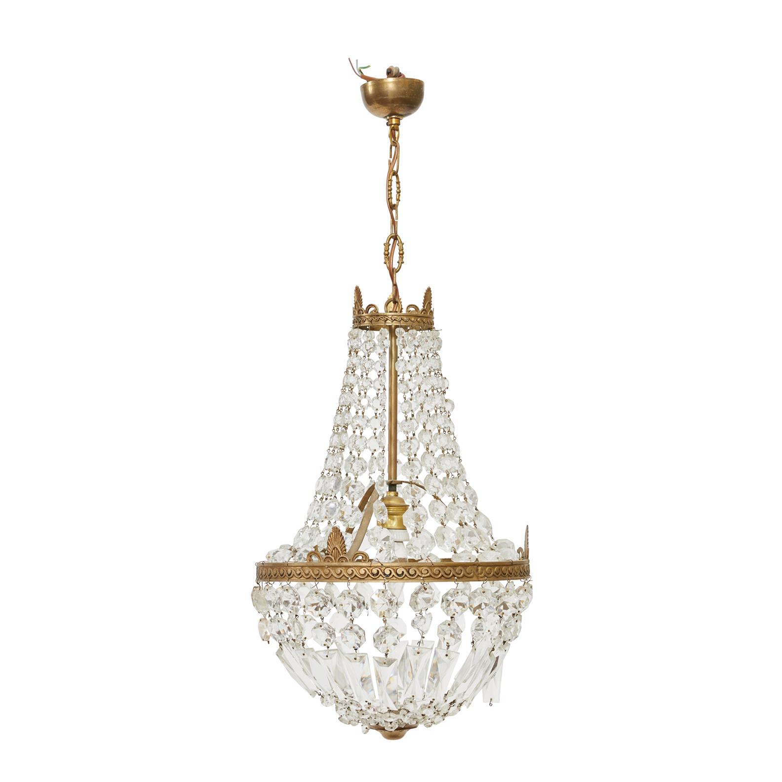 Having central light fitting within a giltmetal corona with anthemion and scroll details, hung throughout with crystal facets and drops.