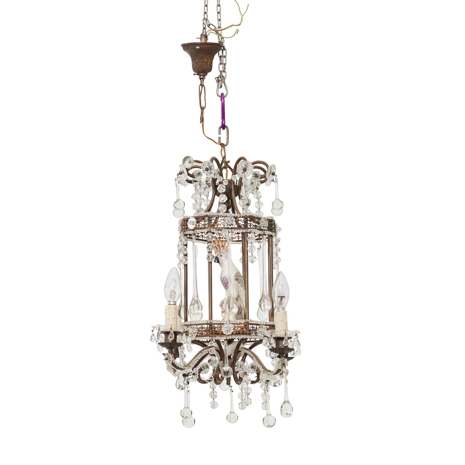 Late 19th century, containing a porcelain parrot within a crystal hung pierced metal cage issuing four scrolled branches, all hung with crystal drops and flowerheads.
