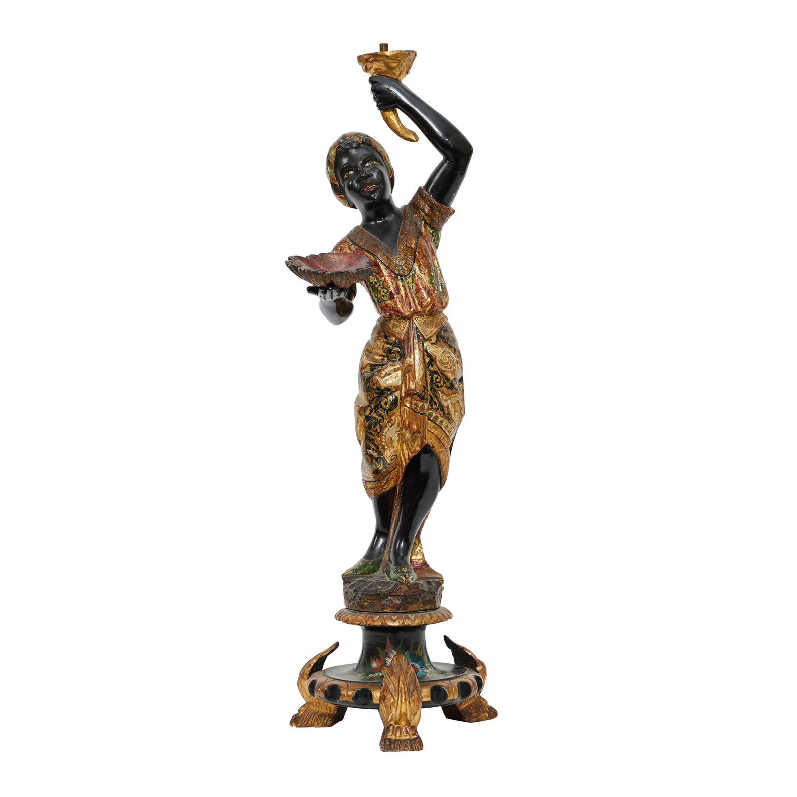 Late 19th century, the figure in elaborate gilt skirt and bodice, bearing a tray in the form of a stylized shell, on floral decorated circular base with lion paw feet.