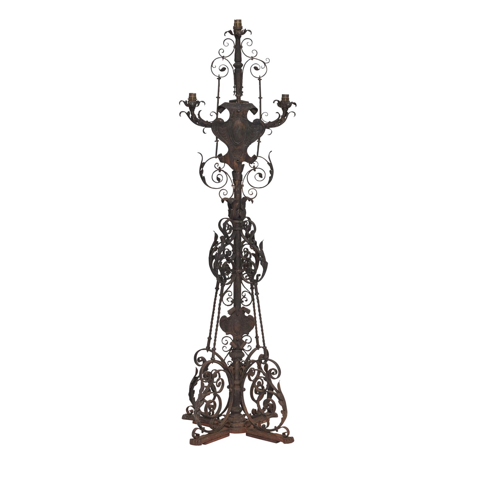 A SPANISH WROUGHT IRON THREE-LIGHT STANDARD LAMP