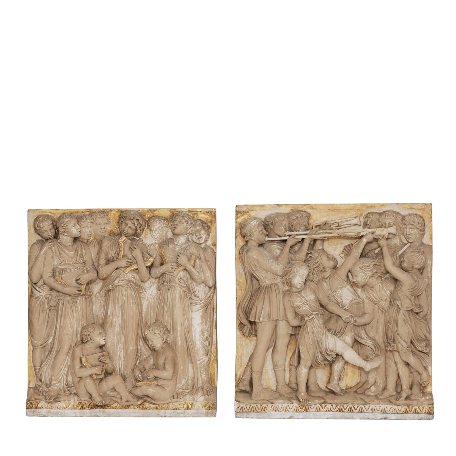 Each cast with a group of singing children and youths playing trumpets and stringed instruments, after the original cantoria in the Duomo Florence.