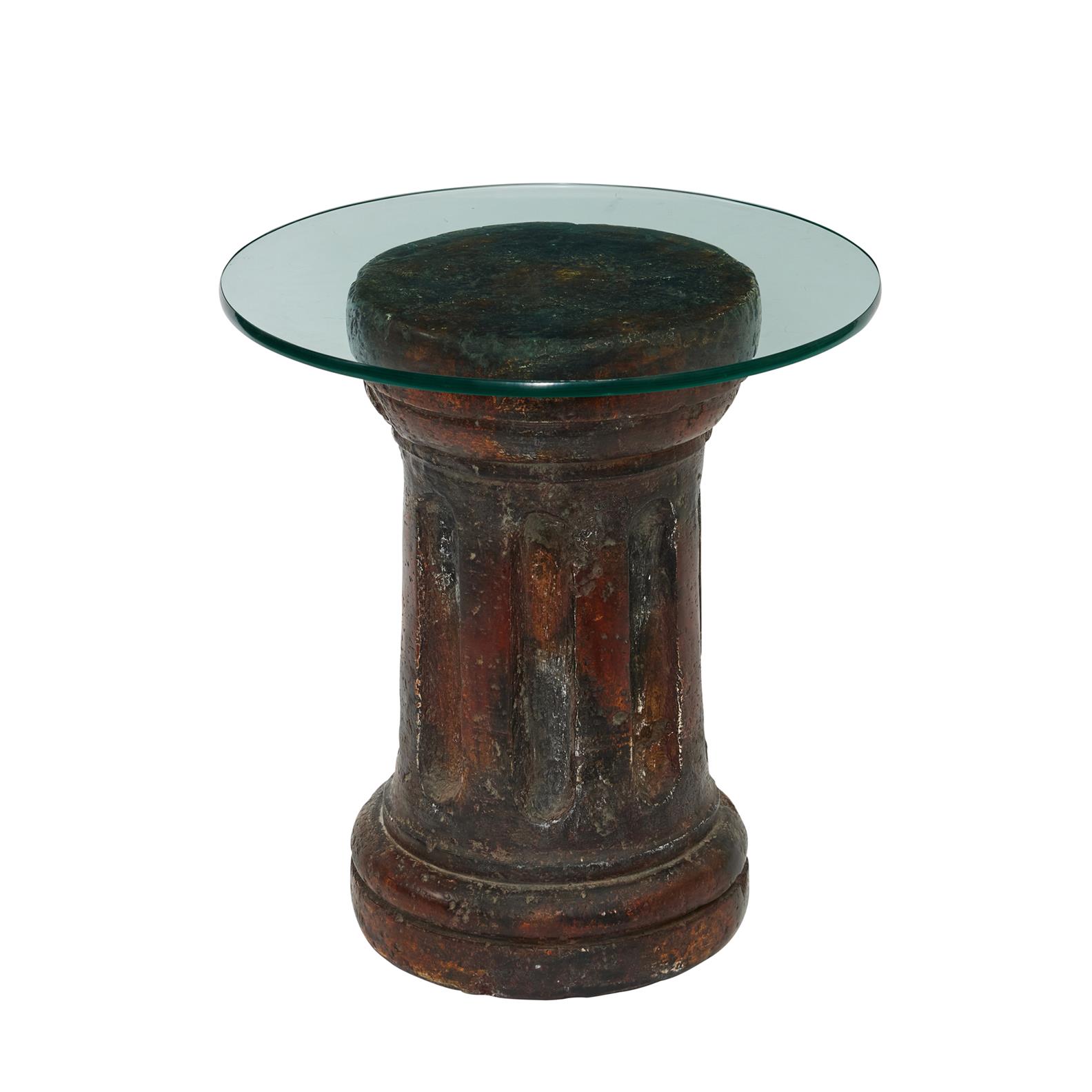 The circular glass top on a base in the form of a fluted column.
