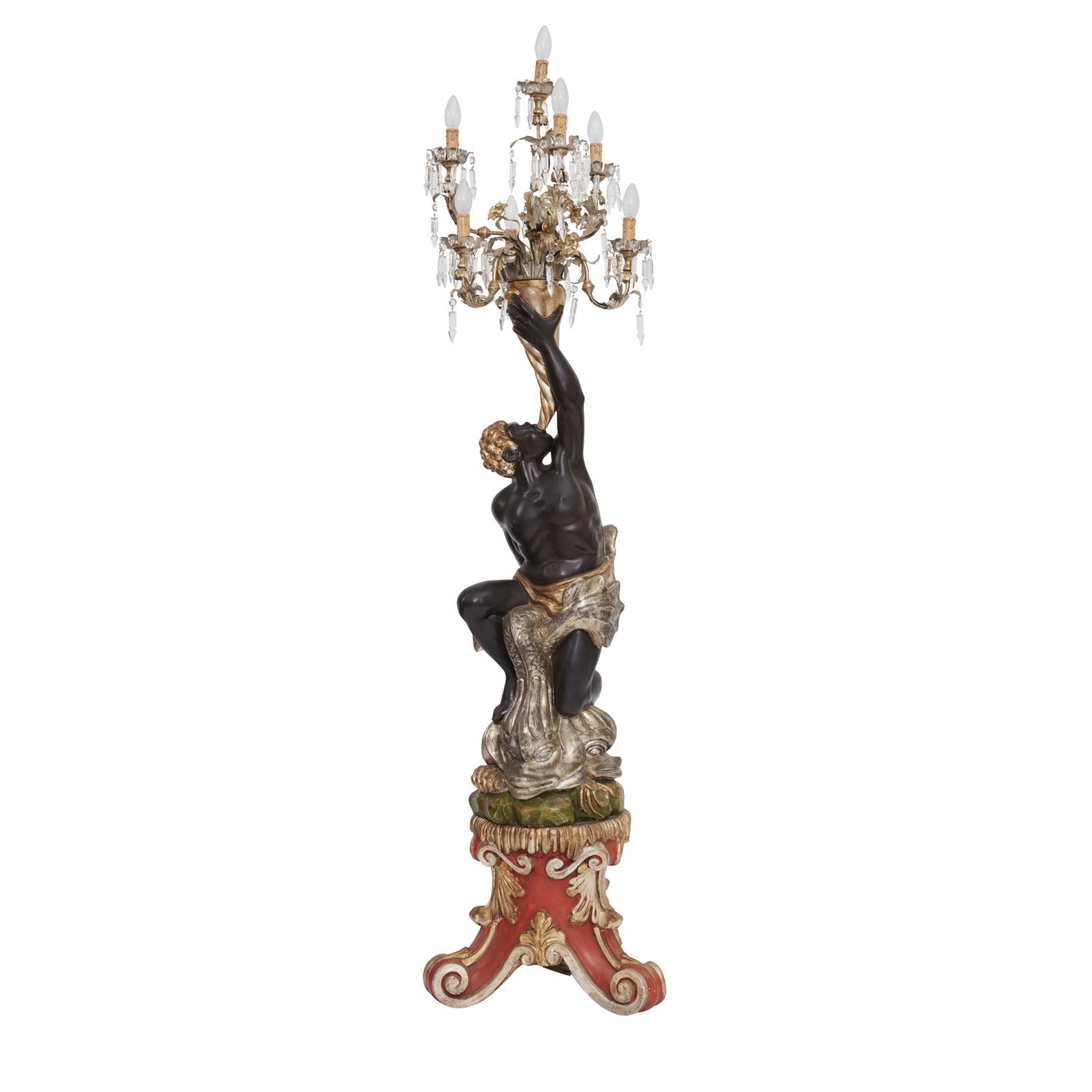 AN ITALIAN BAROQUE STYLE POLYCHROMED FIGURAL SEVEN-LIGHT TORCHERE