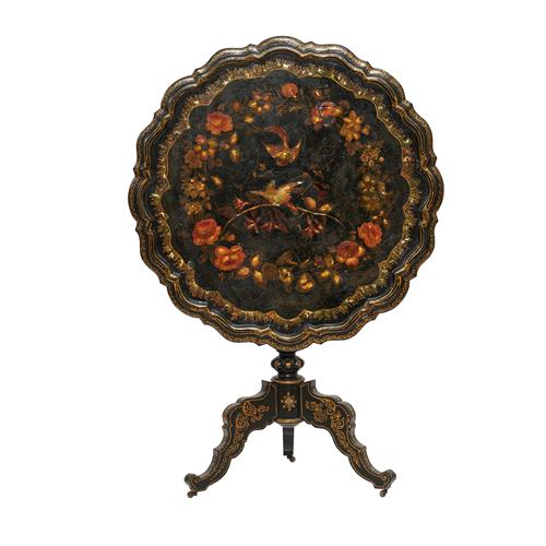 The shaped circular tilt-top painted to the centre with birds and flowers within a gilt scrolled border, on a fluted and gadrooned baluster pedestal and three shaped swept legs with brass castors.