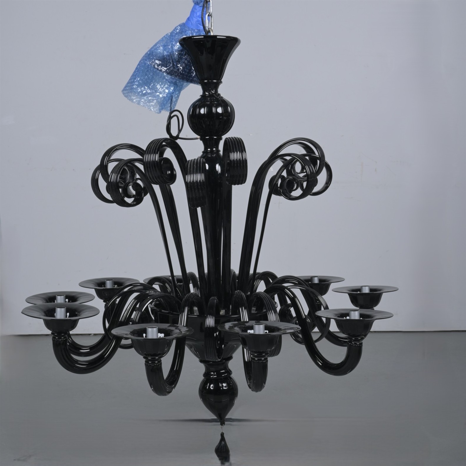 A LARGE MURANO BLACK GLASS CHANDELIER - SIGNS OF REPAIR (A/F) (190H X 105DIA CM) (PLEASE NOTE THIS IS A TWO PROFESSIONAL CARRIER LIFT / REMOVAL. LEONARD JOEL STAFF CANNOT ASSIST IN THE REMOVAL OF THIS ITEM)
