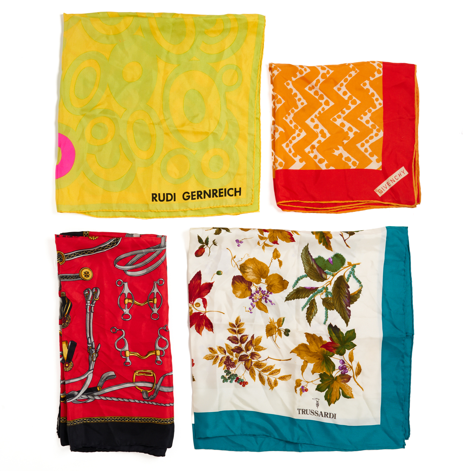 A SET OF FOUR SILK SCARVES COMPRISING A GIVENCHY BANDANA IN RED AND ORANGE WITH CHEVRON PRINT DETAIL , 57 CM SQUARE, A CELINE SCARF IN BLACK AND RED FEATURING HORSE TACK PRINT, 85 CM SQUARE, A TRUSSARDI SCARF IN WHITE WITH TEAL BORDER AND FALL FLORA PRINT, 86 CM SQUARE, AND A RUDI GERNREICH SCARF IN YELLOW AND GREEN MOD STYLE PRINT WITH HOT PINK DETAIL, 78 CM.