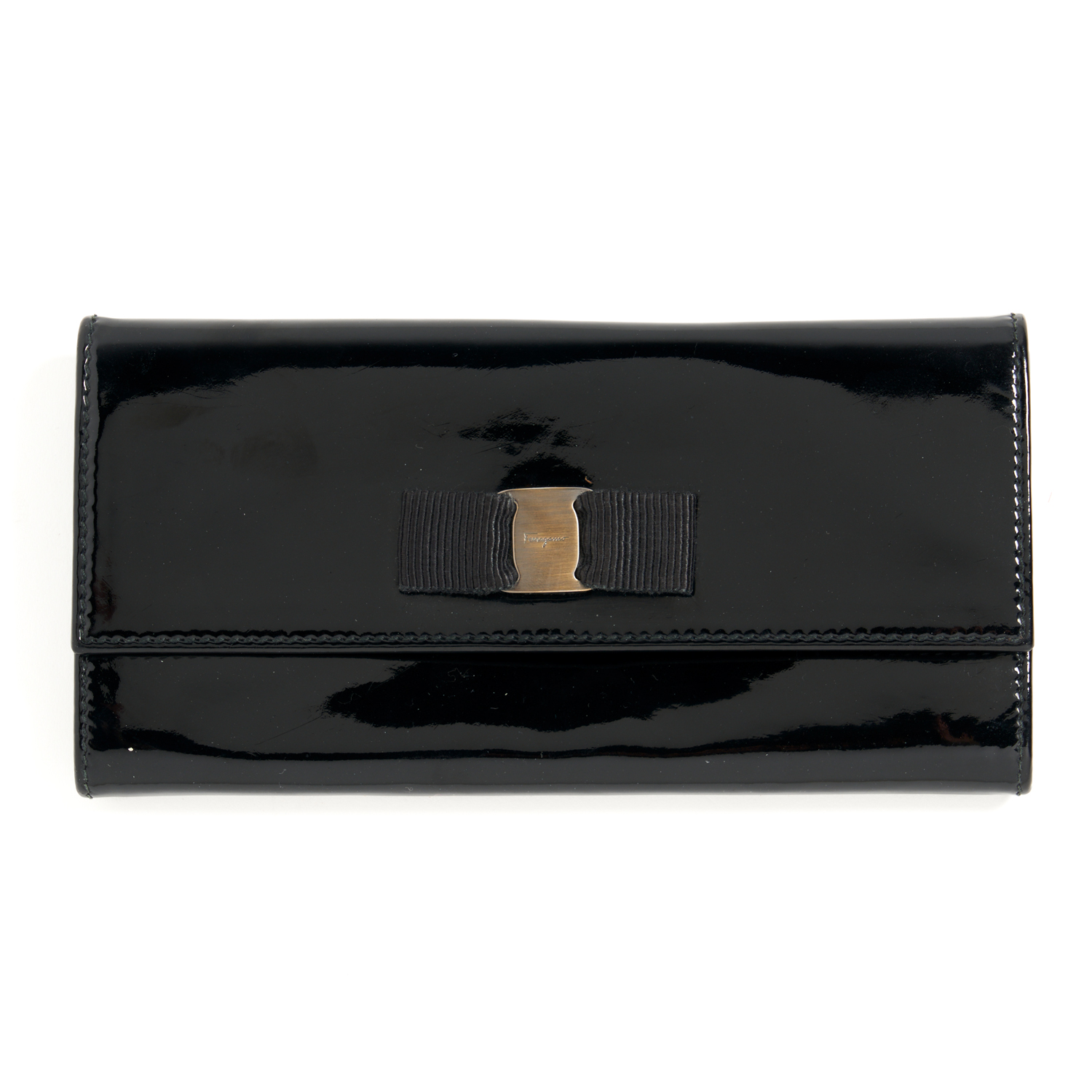 SALVATORE FERRAGAMO, A WALLET STYLED IN PATENT BLACK LEATHER WITH SILVER TONE HARDWARE FEATURING SIGNATURE RIBBON DETAIL, MEASURES 9.5 X 19 X 2 CM