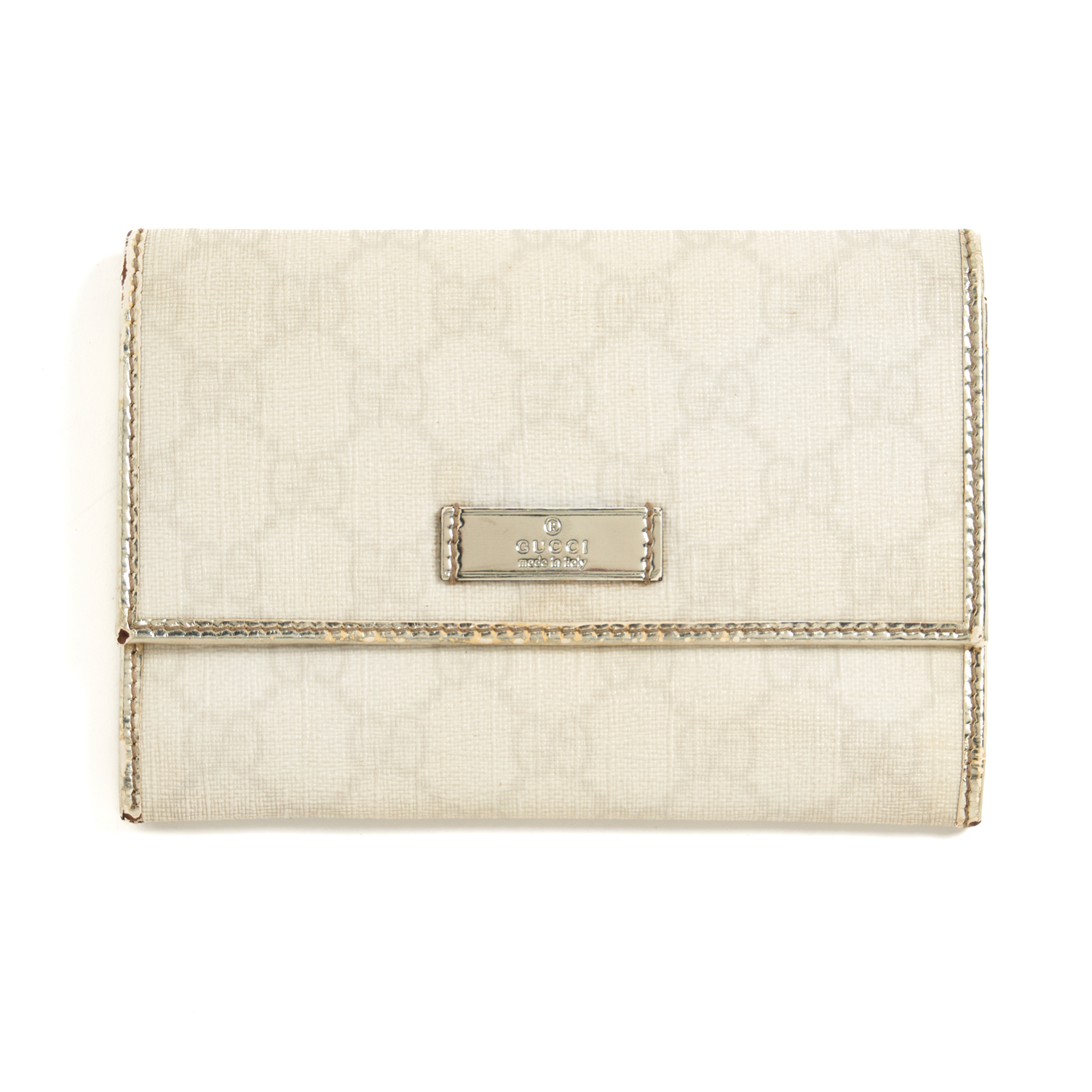 GUCCI, A WALLET, STYLED IN WHITE GUCCISSIMA COATED CANVAS FEATURING METALLIC LEATHER TRIM, MEASURES 11 X 15 X 1.5 CM