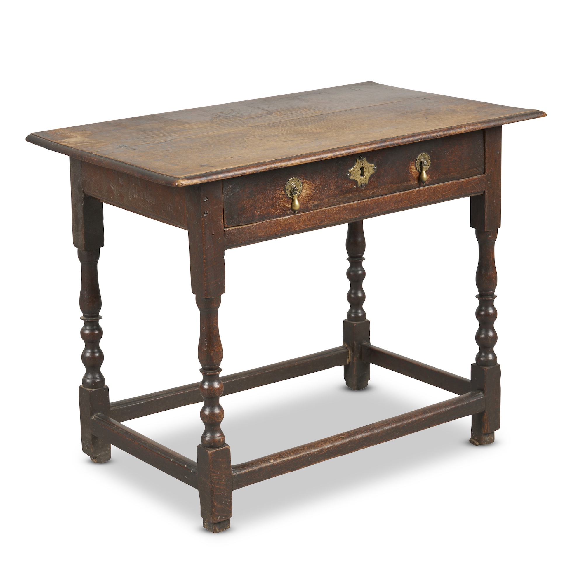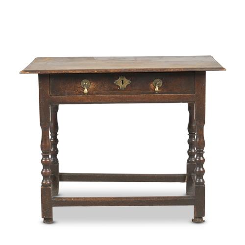 The rectangular top above a frieze drawer, on turned and block supports joined with peripheral stretchers