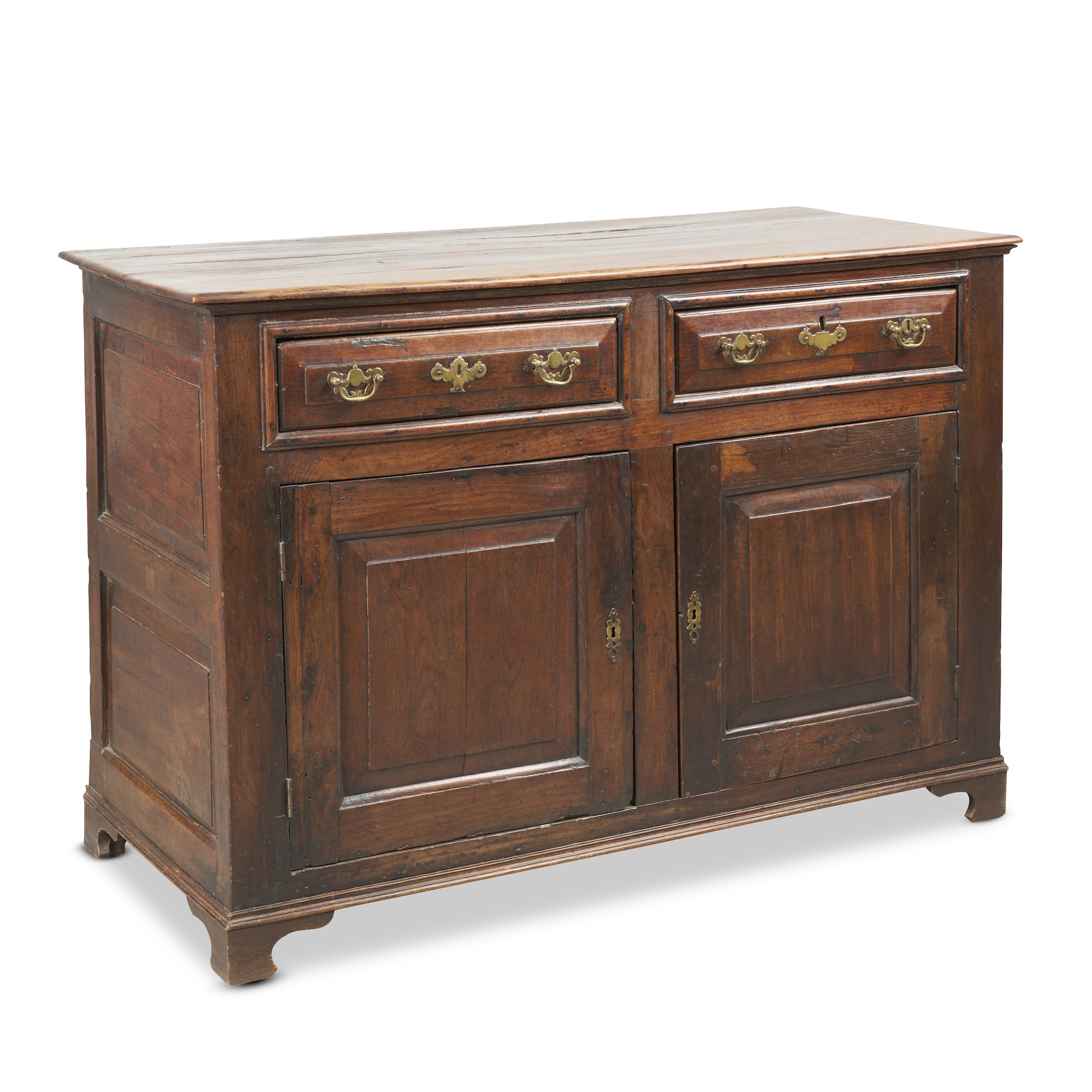 The brasses are sympathetic old replacements. The right drawer retains its original lock but no key for this lock is present. The upper part of its brass escutcheon is lacking. (The left drawer never had a lock; its keyhole escutcheon is bind.) The locks to the doors are modern replacements for which a key is present.