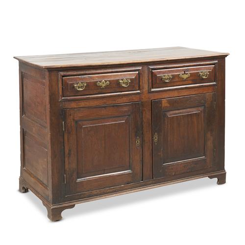 Rectangular, with a pair of frieze drawers above a pair of cupboard doors, on bracket feet, the drawer fronts, doors, and sides with fielded panels