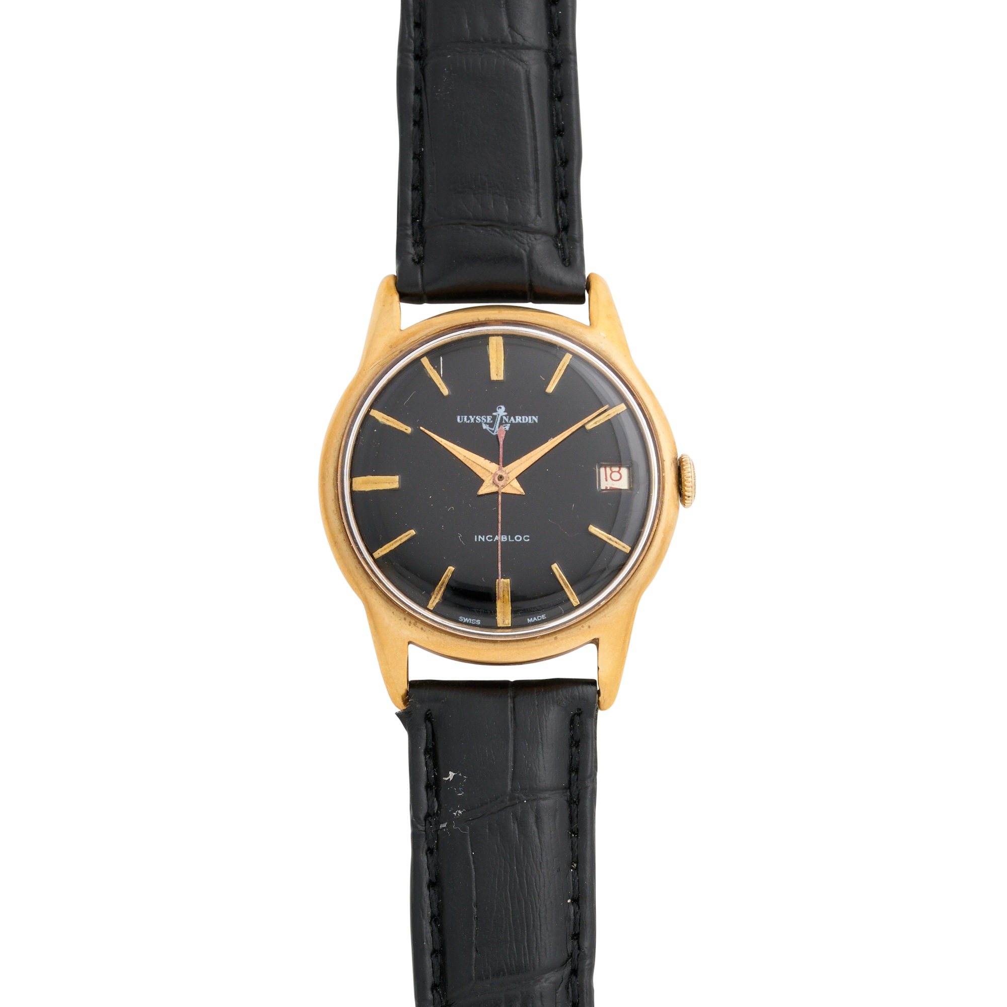 Dial: black, gilt hour markers, centre seconds, date aperture at 3