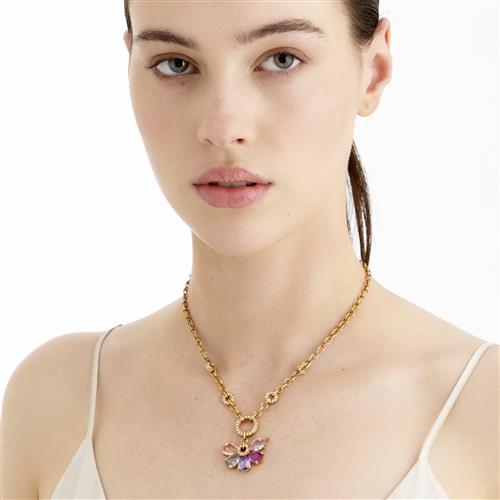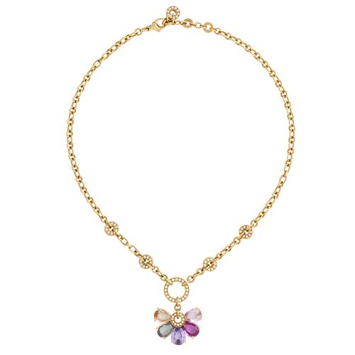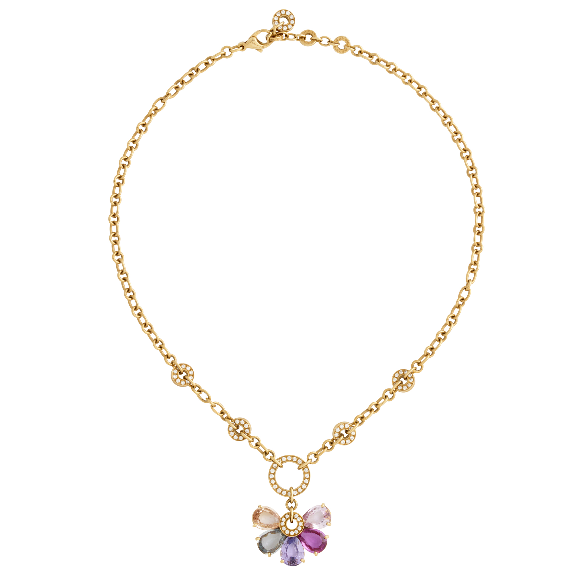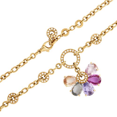 Featuring a floral motif centring an open circle of round brilliant-cut diamonds, within a surround claw-set pear-cut sapphire petals, suspended below a diamond-set circle link, to an integral cable link chain set at intervals with four further diamond-set circle links, completed by a parrot clasp with diamond-set circlet charm detail, signed Bvlgari, length 395 to 420mm (adjustable), gross weight approximately 33.3 grams.