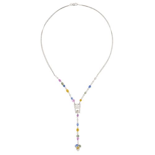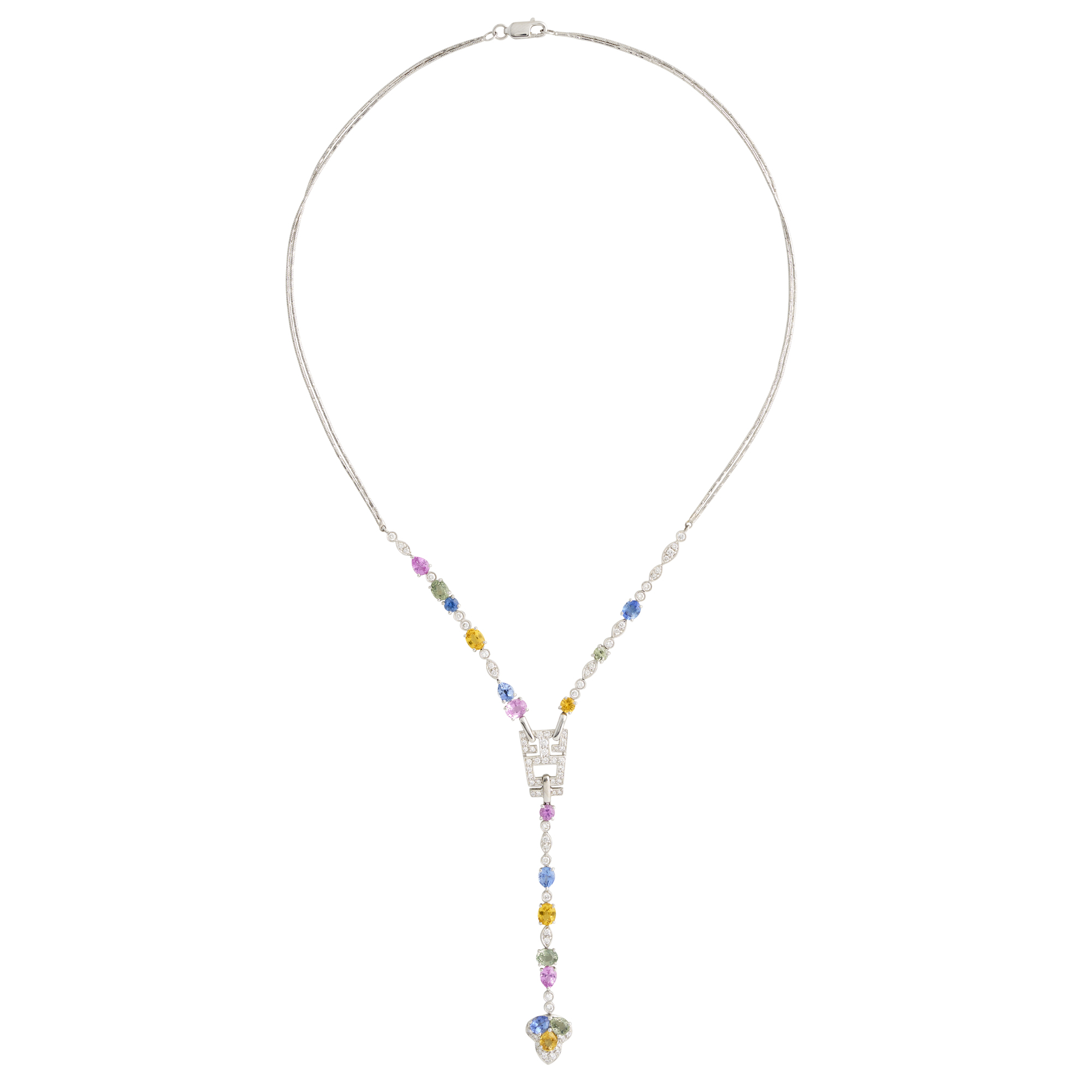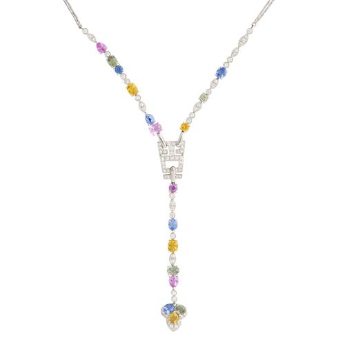 Centring a geometric panel milgrain-set with round brilliant-cut diamonds and suspending a vari-cut multi-coloured sapphire and brilliant-cut diamond drop, to an integral chain partially detailed with further sapphire and diamond details, the sapphires together weighing approximately 6.44 carats, the diamonds together weighing approximately 0.97 carats, completed by a parrot clasp, signed HB for Hardy Brothers, length 420mm, gross weight approximately 15.3 grams.