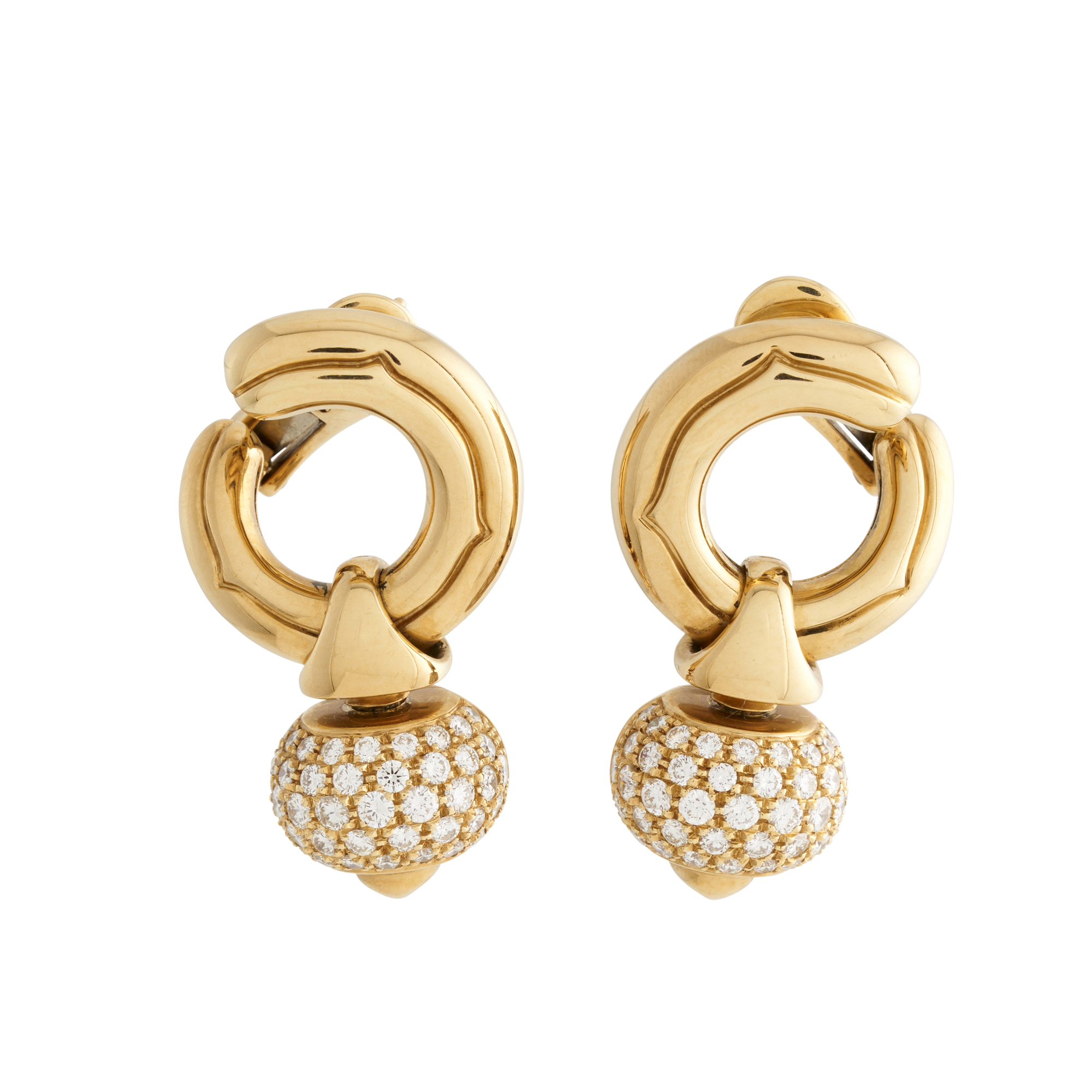 Each earring suspending a domed drop pavé-set with round brilliant-cut diamonds, to a circular polished surmount, the diamonds together weighing approximately 2.22 carats, signed Bvlgari, to post and clip fittings, length 35mm, gross weight approximately 29.3 grams.