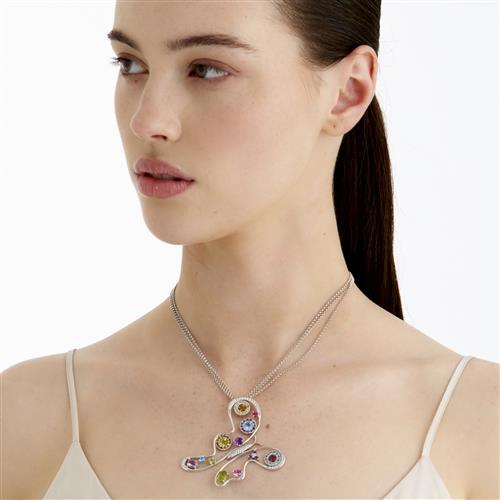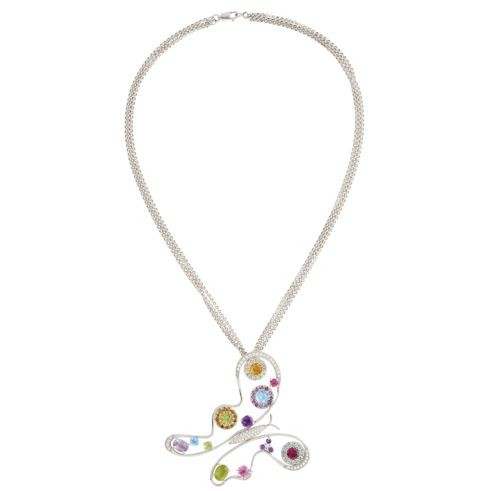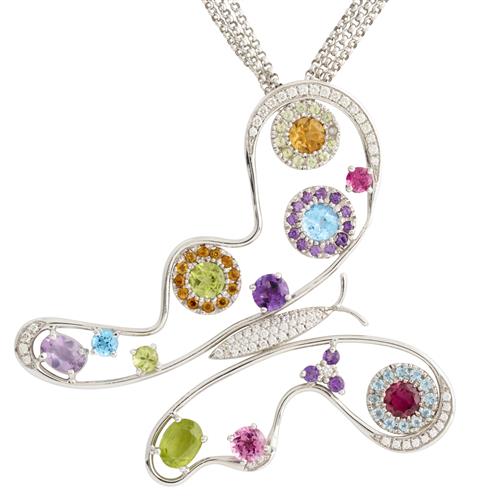 Modelled as a butterfly, set throughout with claw-set round brilliant-cut diamonds and vari-cut citrine, amethyst, blue topaz, peridot and pink tourmaline, the diamonds together weighing approximately 0.67 carats, suspended from a triple fine cable link chain completed by a parrot clasp, Pendant length 65mm, width 70mm, chain length 420mm, gross weight approximately 20.5 grams.