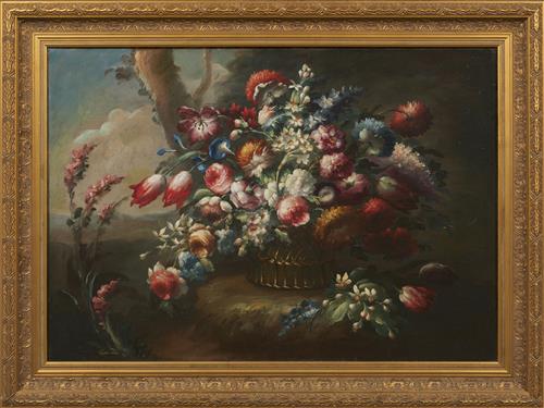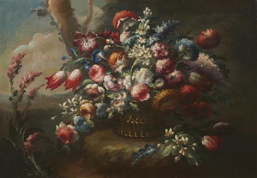 A basket of mixed flowers in a landscape, in early eighteenth century Flemish style