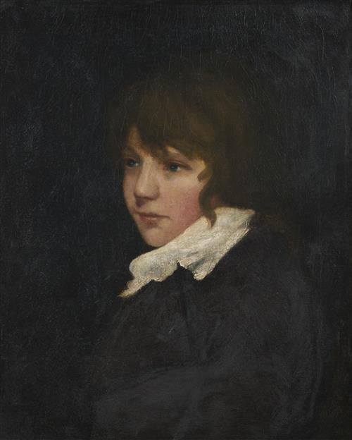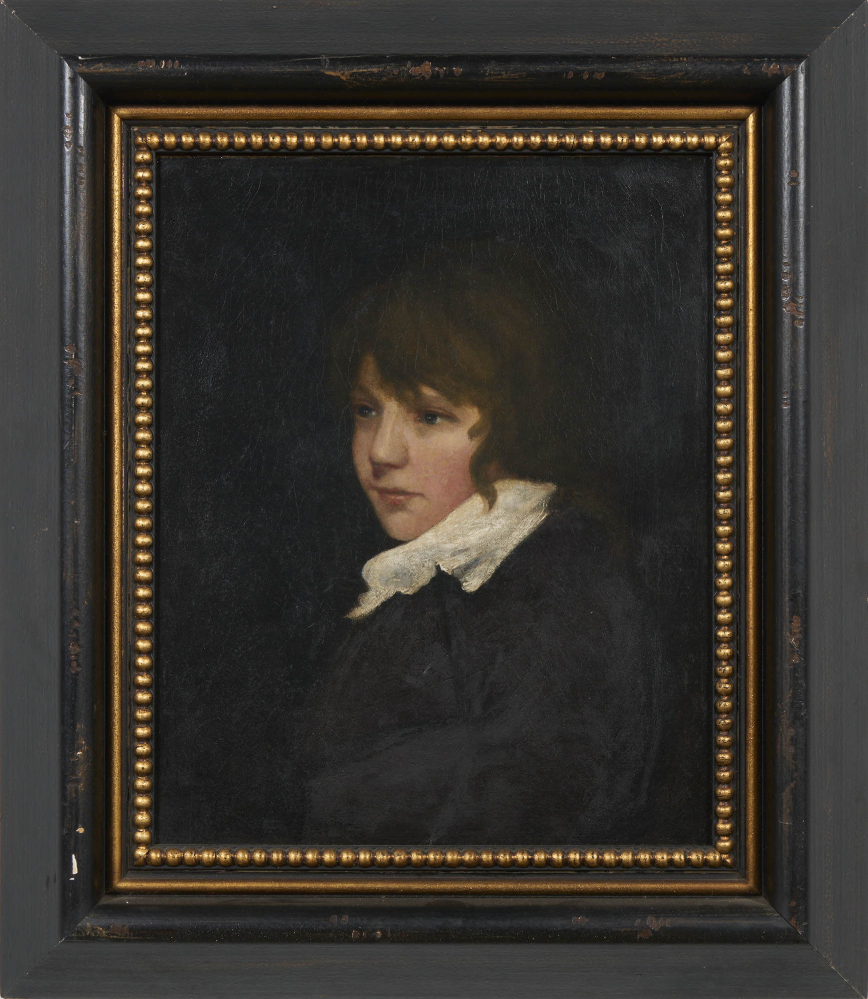 A bust-length portrait of a boy wearing a white collar above a dark coat