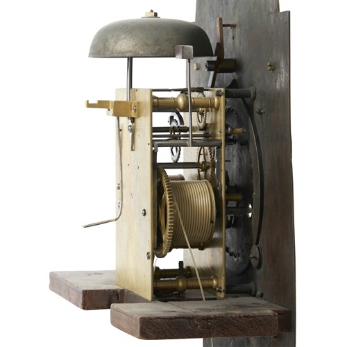 The eight-day movement with anchor escapement striking on a bell on the hour, the silvered Roman numeral dial with subsidiary seconds dial and calendar aperture within applied brass foliate spandrels, the glazed bell-top hood of architectural design with moulded cornice and gilt blind fretwork frieze surmounted with three ball finials above columns to the corners, the trunk of typical form with a panelled door with glazed pendulum aperture above the plinth base, the green-japanned case decorated to the front in raised gold and coloured lacquer with Chinese-style scenes of figures, animals, and birds in landscapes with buildings, floral and foliage decoration elsewhere