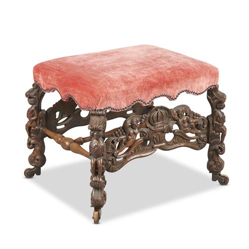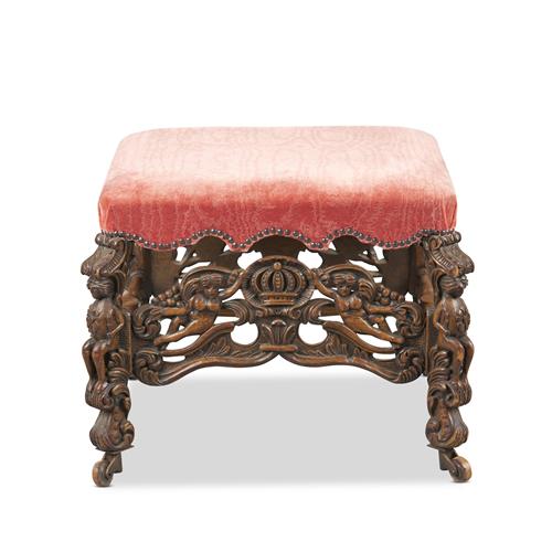 Rectangular, the upholstered seat in close-nailed pink cut velvet raised on four canted sculptural supports carved with seated figures and foliate scrolls, the long sides with stretchers carved and pierced with nude female figures centred on a crown, on casters with wood wheels
