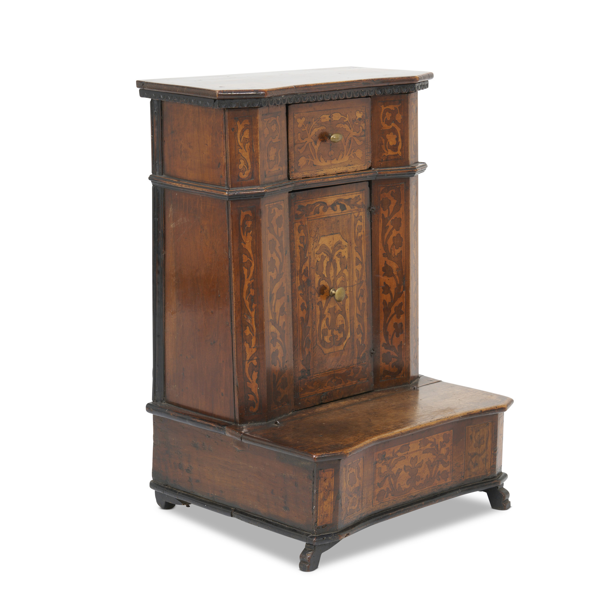 A BAROQUE PERIOD NORTH ITALIAN WALNUT AND MARQUETRY INGINOCCHIATOIO